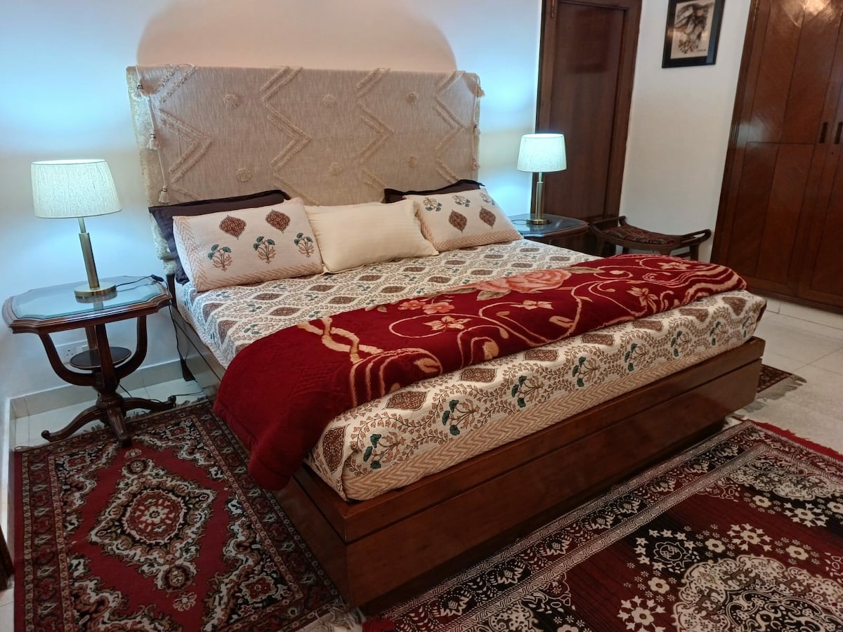 Želite li se povezati s porodicom, prijateljima ili kolegama u krilu prirode u New Delhiju? Želite li doživjeti idealnu mješavinu šarma starog svijeta i gostoprimstva sa svim modernim sadržajima? Želite li prošetati prostranim travnjacima ispod voćaka ili čekati paunove? Ako je ODGOVOR DA, onda ovaj nezavisni trosobni stan u vili Shiv Niwas, s privatnim balkonima i krovnom terasom, pametnim bravama, brzim Wi-Fi mrežom širom objekta, besplatnim parkingom za automobile i brižnom damom koja kuha!