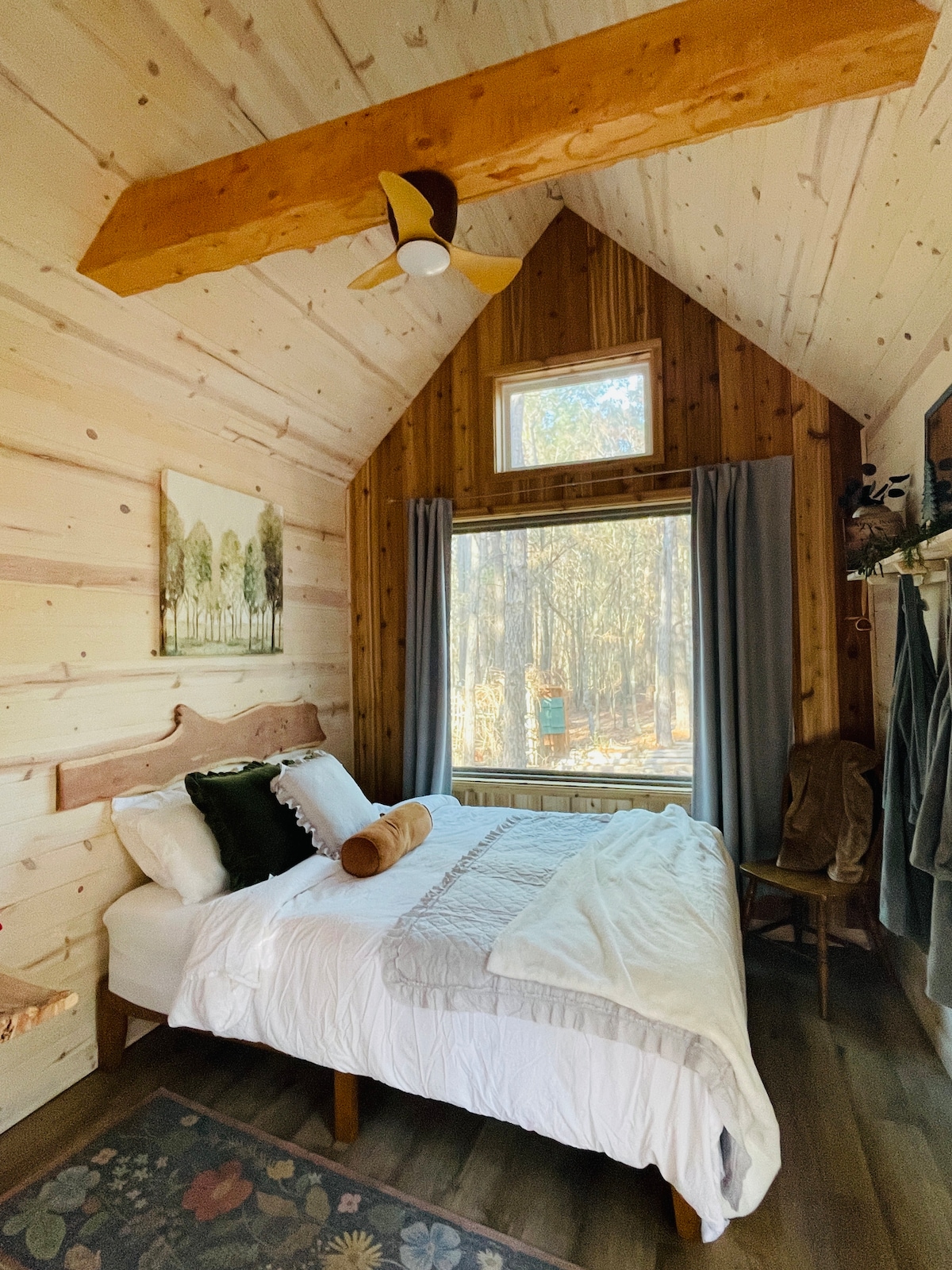 Zaboravite na svoje brige u ovom prostranom i mirnom šumovitom predjelu borove šume istočnog Teksasa. Opustite se, opustite i uživajte u čaši vina na našoj terasi s pogledom na krošnje drveća. 1 bračni krevet (1,4x2). 2 kauča na razvlačenje. Kafa je dostupna u brvnari. Mikrovalna pećnica i frižider na licu mjesta. Boce vina su dostupne za kupovinu. Trebate li dodatni smještaj? Samo pitajte! Učinit ću sve što je u mojoj moći da to učinim.
