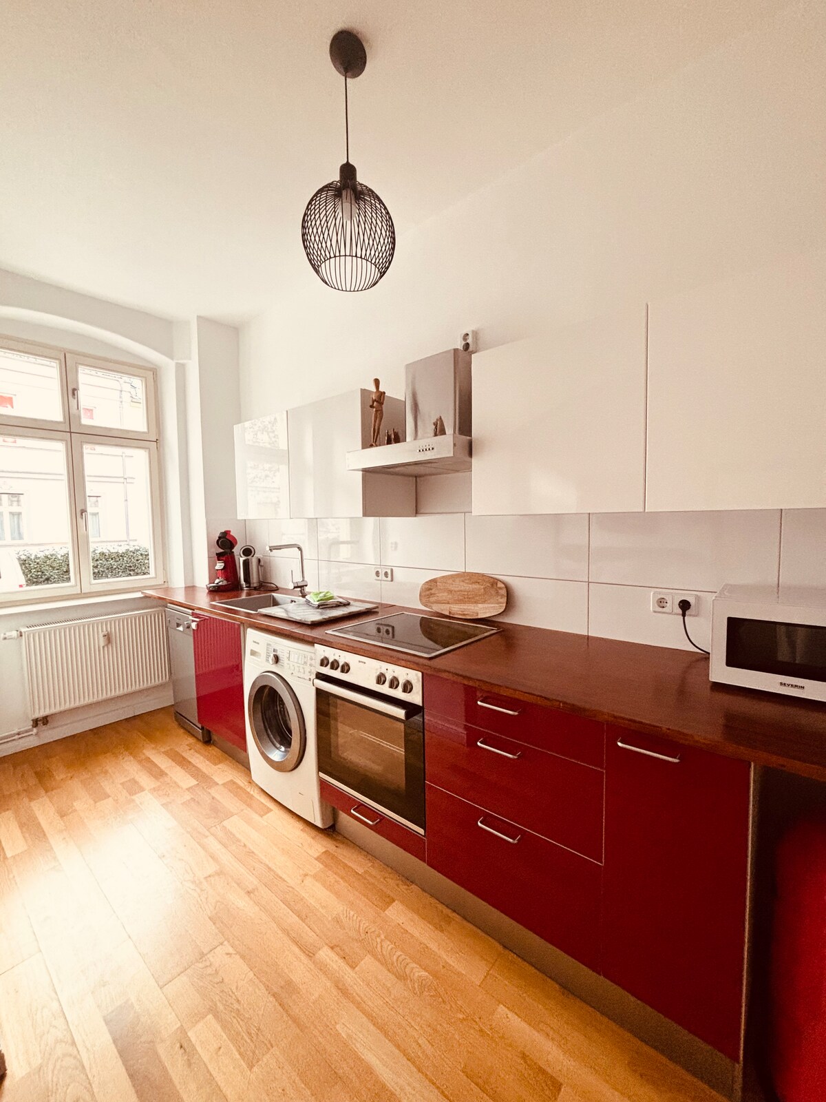 Ovaj novouređeni 1,5-sobni stan s balkonom nalazi se usred Potsdam-Babelsberga. Prodavnice, kafići, restorani i barovi nalaze se na pješačkoj udaljenosti. Od stana možete doći do centra Potsdama za oko 10 minuta javnim prevozom. Stanica S-Bahn Babelsberg također je udaljena manje od 10 minuta hoda. Odatle postoji direktna veza s Berlinom sa S7.