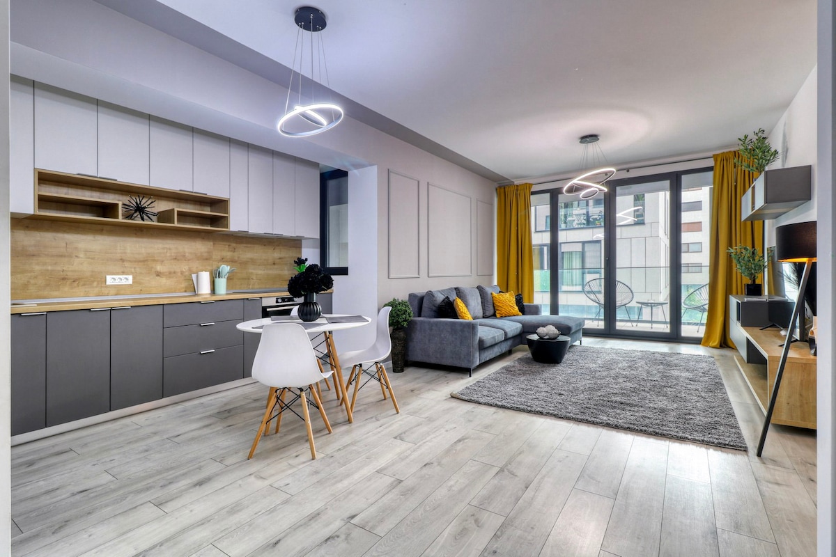 Doživite otmjen život u ovom elegantnom jednosobnom stanu samo nekoliko koraka od parka Herăstrău. Stan ima savremeni dizajn, vrhunsku završnu obradu, prostrani dnevni boravak i potpuno opremljenu kuhinju. Savršeno za poslovne boravke ili boravke u slobodno vrijeme, s jednostavnim pristupom kafićima, finim restoranima i živahnoj sjevernoj strani grada. Sigurna zgrada, brz Wi-Fi i vrhunska udobnost.