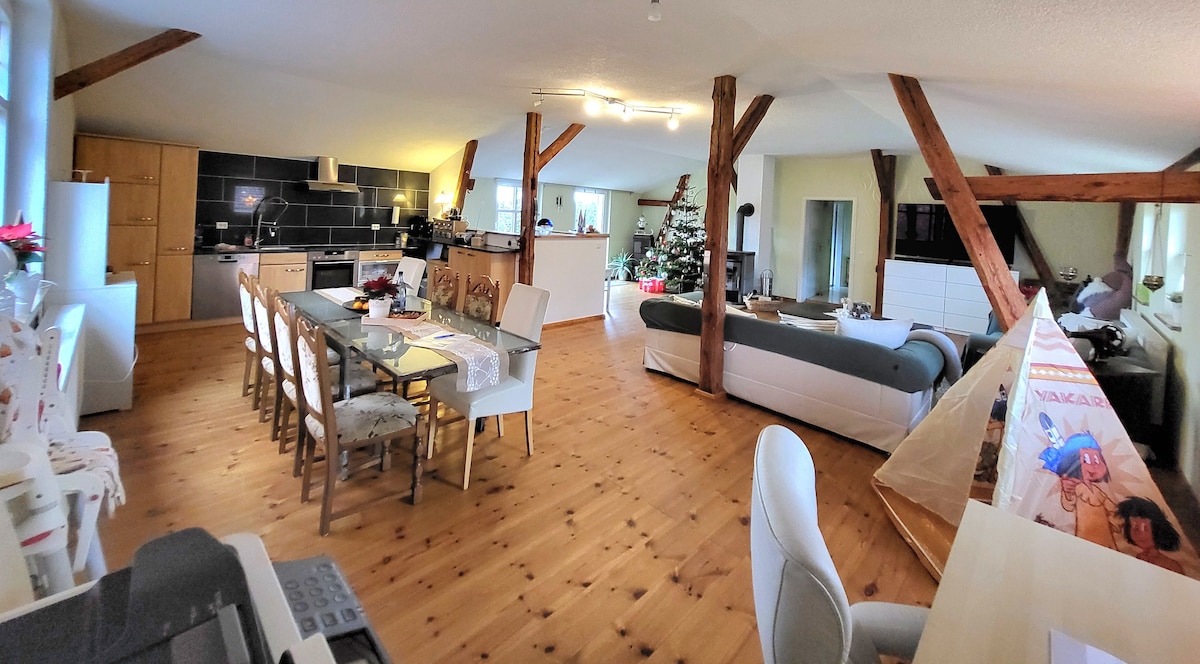 Uživajte u miru i sigurnosti ovih starih zidova. Okružen drevnim drvećem u okrugu Mecklenburg. Vaš stan je na 1. spratu i pažljivo je renoviran. Obnovili smo stare tvornice gline, otkrili drevne podne daske, a samo je najbolja boja od gline došla do zidova. HideAway je zaokružen malim kaminom od lijevanog željeza za večeri i privatnom saunom na rubu polja ... Volimo djecu 🧡🌟 Na farmi žive 4 mačke i 1 pas;-)