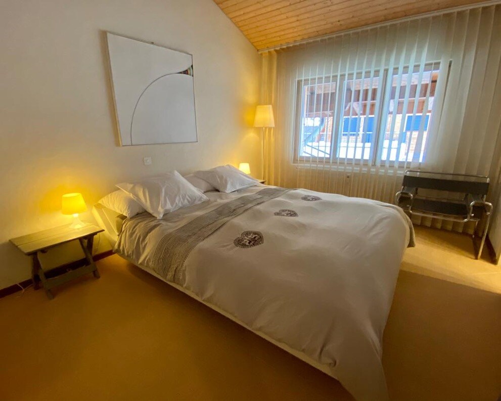 Prekrasan stan u potkrovlju u prestižnoj planinskoj kući u blizini Gstaada. Spektakularan pogled na planine, mirna lokacija bez prometnice. 3 sobe 2 spavaće sobe s 4 kreveta Maksimalno 4 osobe 5 minuta automobilom do centra sela, žičare i supermarketa Ulazni hodnik, otvorena kuhinja, dnevni boravak s kaminom i stolom za blagovanje, 2 sobe s bračnim krevetima. 1 kupatilo s jacuzzijem, talijanskim tušem/WC-om i odvojenim WC-om. Mašina za pranje veša i mašina za sušenje veša. Vrlo veliki balkon okrenut prema jugu.