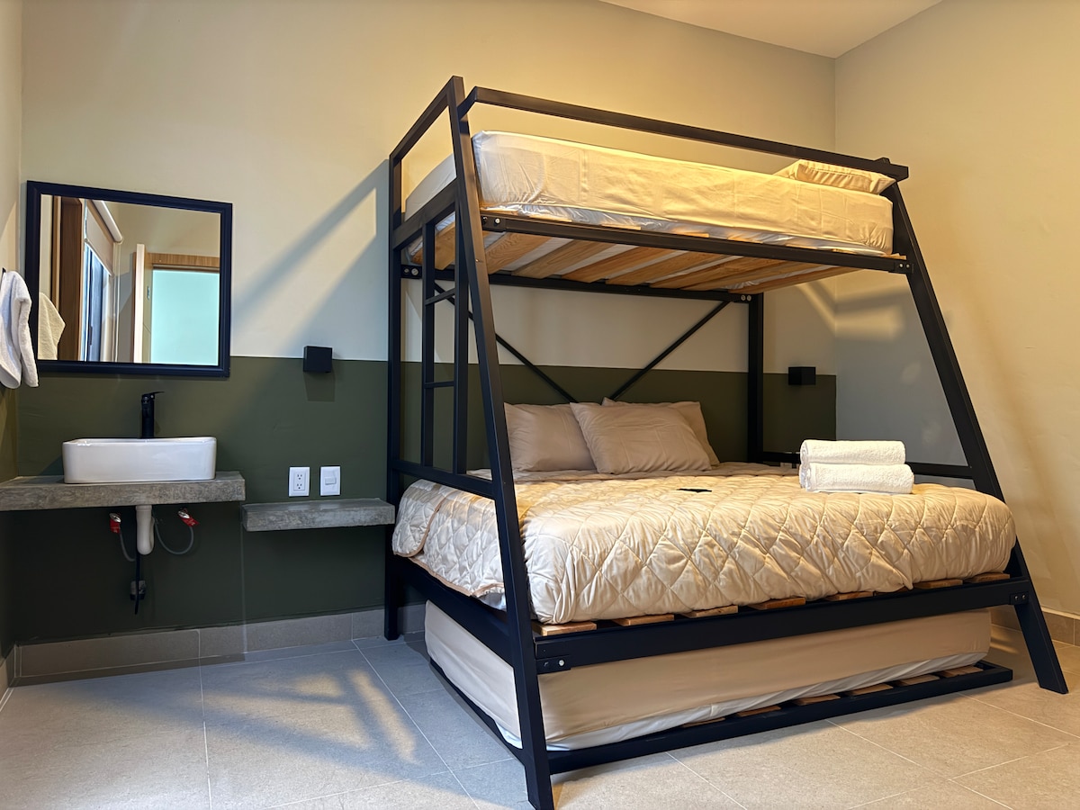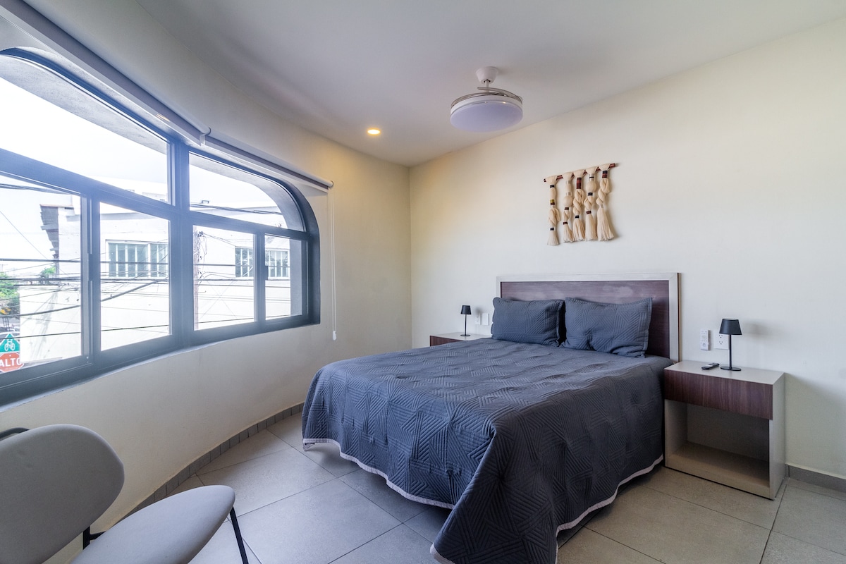 Prostrana soba s bračnim krevetom i samostalnim dolaskom Bračni ✔ krevet (160x200) ✔ Pametni TV s platformama za streaming ✔ Brzi internet savršen za rad na daljinu ✔ Stropni ventilator i fen za kosu ✔ Poseban mini frižider ✔ Privatno kupatilo s elegantnom završnom obradom ✔ Zajednička kuhinja po spratu opremljena ✔ Krovna terasa s trpezarijom na otvorenom i panoramskim pogledom Ovaj apartman spaja udobnost, prostor i moderan dizajn na nenadmašnoj lokaciji u Colonia Americani. Samo nekoliko koraka od Chapultepekovih kafića, restorana i umjetničkih galerija.