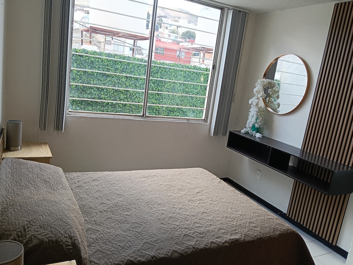 Luksuzni stan za do 8 osoba, uključuje privatni parking unutar zgrade. Ima 3 dvokrevetne spavaće sobe, 2 kupatila i trpezariju s pametnim TV-om i kaučem na razvlačenje. Naš smještaj ima nevjerovatan pogled na brdo La Bufa. Nalazi se 10 minuta od historijskog centra vozeći vozilo. Također je udaljen 2 bloka od cestovnog distributera gdje možete brzo izaći i uputiti se bilo gdje u gradu Zacatecas.