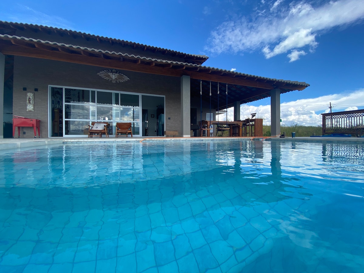 Ranč u Ponta do Solu, u Capitólio/MG! Kuća na rubu jezera Furnas, s kompletnim prostorom za odmor (bazen, mokri bar, roštilj, peć na drva). Kuhinja opremljena industrijskim šporetom od 4 usta s rernom, mikrovalnom pećnicom, frižiderom i horizontalnim zamrzivačem. Dnevni boravak s zidanim kaučem, TV-om od 21"s Hi TV-om i Wi-Fi mrežom. Imamo i 42" smartv s pristupom internetu. Maksimalno 12 osoba u krevetima Ima 3 spavaće sobe (1 apartman). Ima 2 unutrašnja kupatila sa tuš kabinom i 1 kupatilo i 1 vanjsko kupatilo sa tuš kabinom.