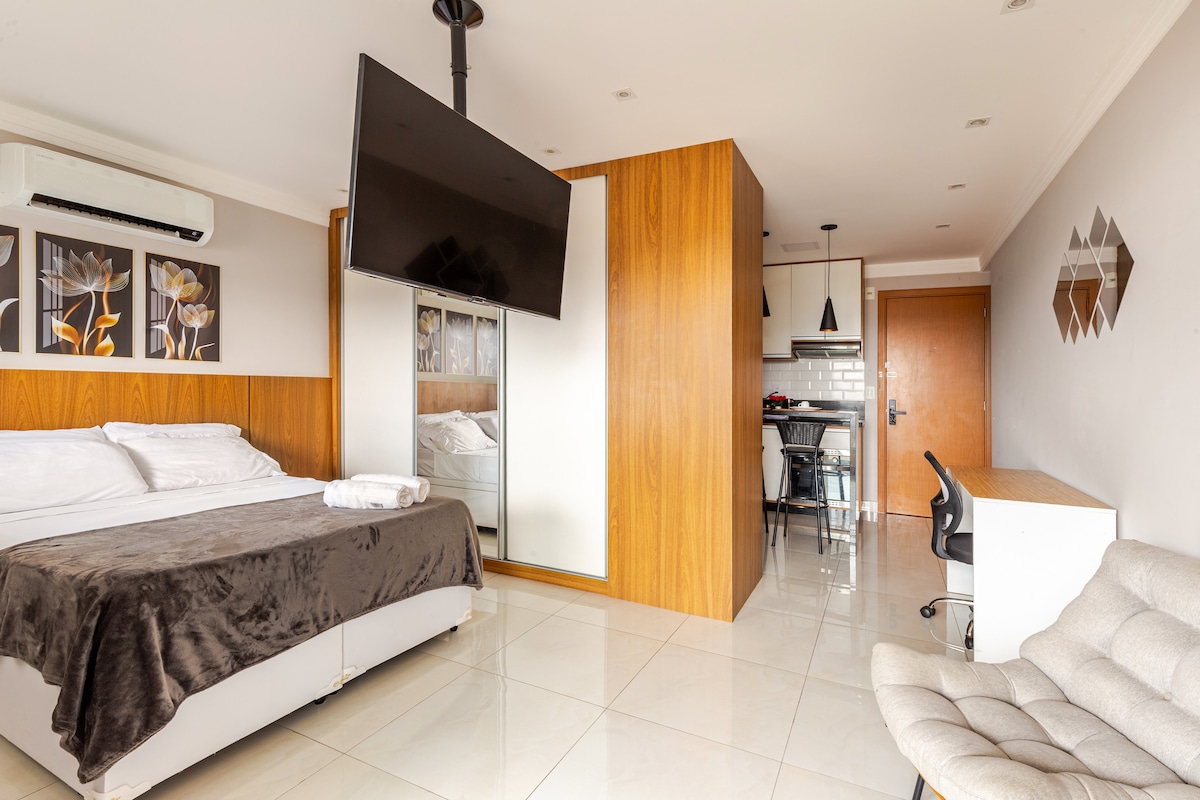 Moderan i udoban studio, savršen za vaš boravak! Ima bračni krevet, udoban kauč na razvlačenje i ekskluzivni prostor za rad. Kuhinja je kompletna, opremljena rernom, pločom za kuhanje, frižiderom, mikrovalnom pećnicom i priborom. Uživajte u nevjerovatnom pogledu i udobnosti klima-uređaja. Kondominij nudi sigurnost i strukturu za miran boravak. Odlična lokacija s jednostavnim pristupom prodavnicama i prevozu. Idealno za poslovna putovanja ili putovanja u slobodno vrijeme!
