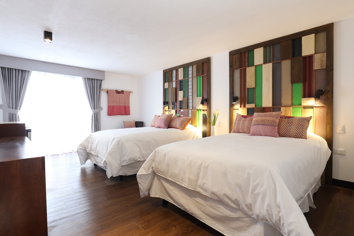 Acogedora y funcional, esta habitación es perfecta para quienes buscan un espacio cómodo y bien ubicado para descansar después de explorar Antigua. Cuenta con dos camas matrimoniales, baño privado, ventiladores, TV con cable, caja de seguridad y amenidades esenciales. Aunque su tamaño es compacto, está cuidadosamente equipada para brindarte una estancia tranquila y sin complicaciones. Ideal para viajeros solos o en pareja que valoran la comodidad, el servicio cercano y el ambiente colonial.
