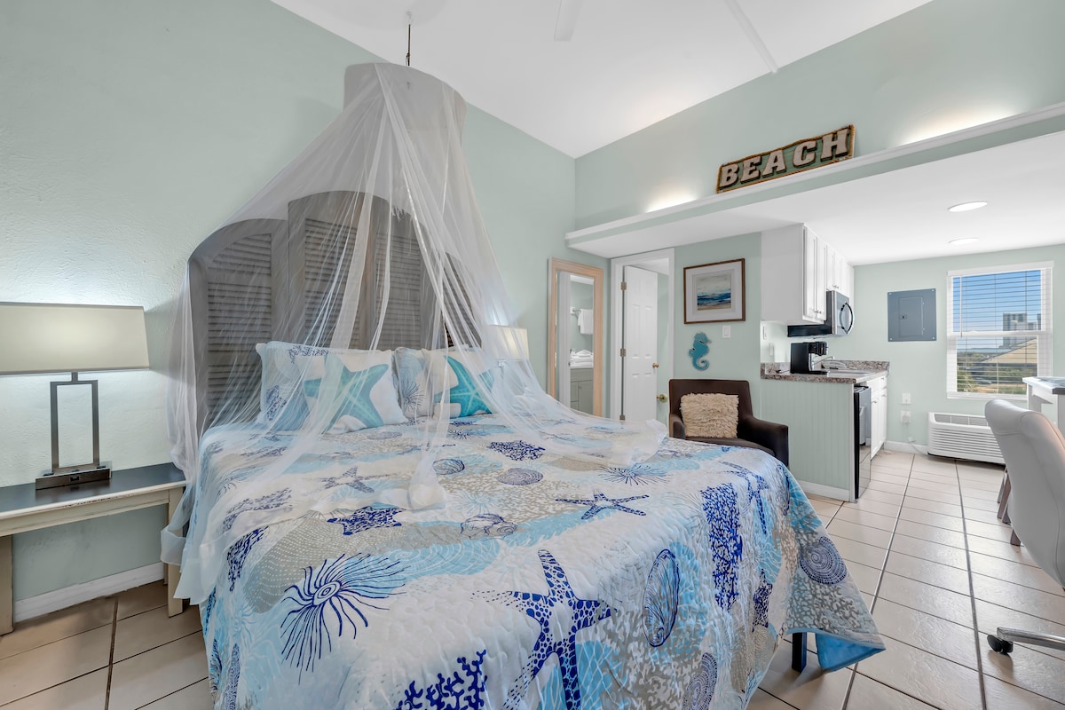 Minimalna dob za rezervaciju je 19 godina. NOVI SISTEM TOPLE VODE U ZGRADI! 19.11.2025. Družite se u HANGOUTU! Pogledajte ovaj historijski hotel – studio s čajnom kuhinjom odmah preko puta plaže Gulf Shores State Beach, lokacije za hranu i zabavu The Hangout, Pink Pony, Papa Rocco's Pizzeria, De Soto's Seafood, Picnic Beach, Mikees Seafood i još mnogo toga. Savršeno za parove! JEDAN BRAČNI krevet (širok 180–220 cm), kauč na razvlačenje za malo dijete, frižider odgovarajuće veličine, sudoper, mikrovalna pećnica, ploča za kuhanje i JEDNA BESPLATNA propusnica za parking na parkiralištu Beachview, BESPLATAN INTERNET.