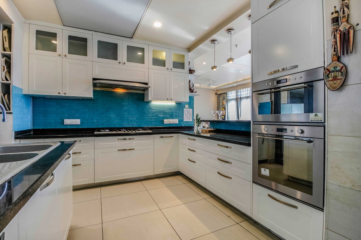 Stay in a spacious 4-bedroom luxury residence in one of Gurgaon’s most sought-after gated communities, ideal for families, expat relocations, business travelers and medical stays. Close to Golf Course Road, Grand Hyatt hotel and major hospitals, the home offers expansive living spaces, a full kitchen, daily housekeeping, optional home-cooked meal service and peaceful high-floor living designed for quiet residential stays.