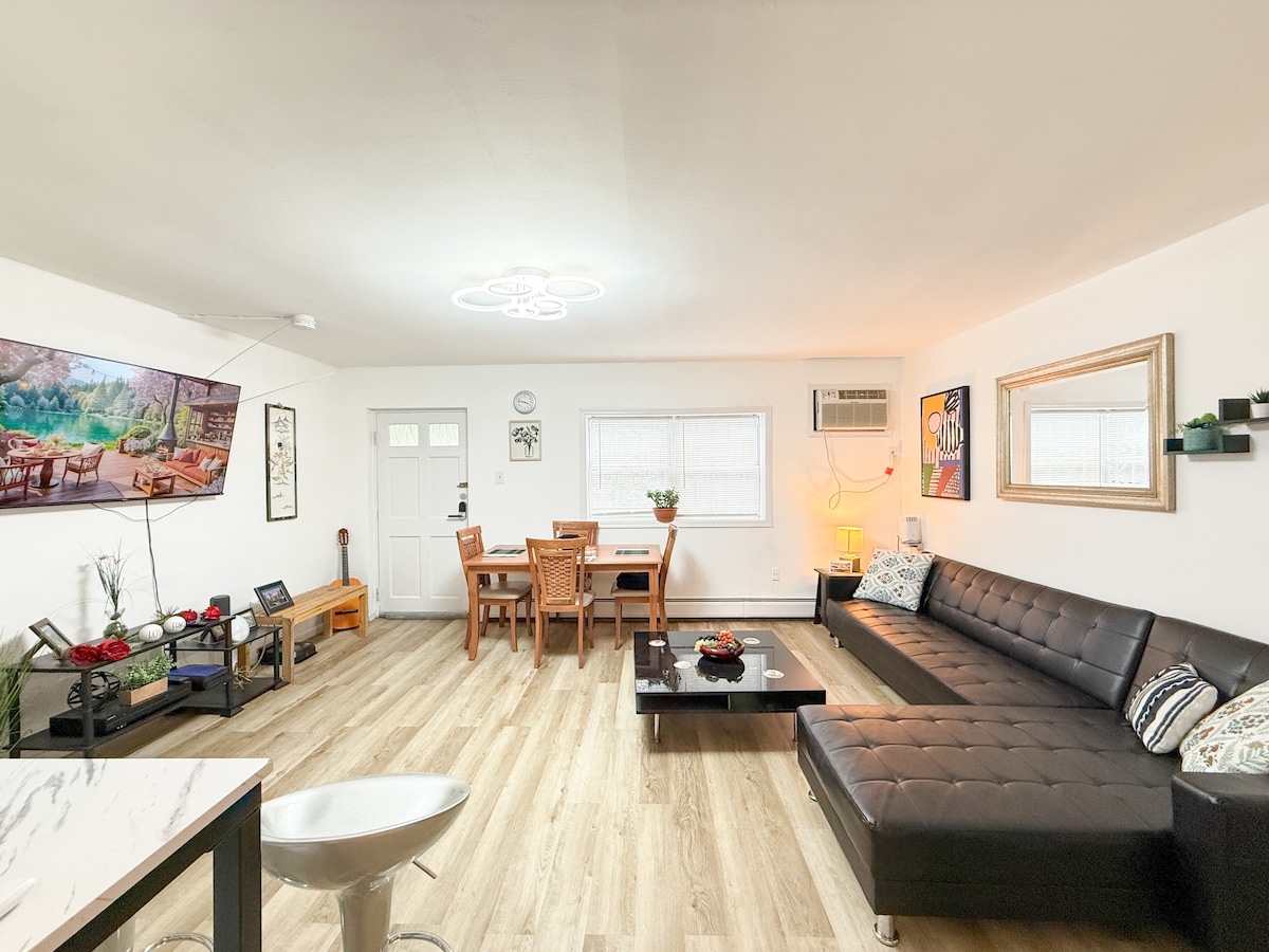 "Suburb Charm - just 1 swift bus hop (10-min ride) to Times Square in NYC! Buses operate round-the-clock, a mere 2-minute stroll from your abode. - Free Parking Revel in safety and tranquility in our suburban enclave. Your impeccably-kept 1-bedroom retreat awaits, featuring a private bath, kitchenette, and workspace. Beautiful hardwood floors, refined touches, and NYC vistas just steps away. Central Air Conditioning and Heating