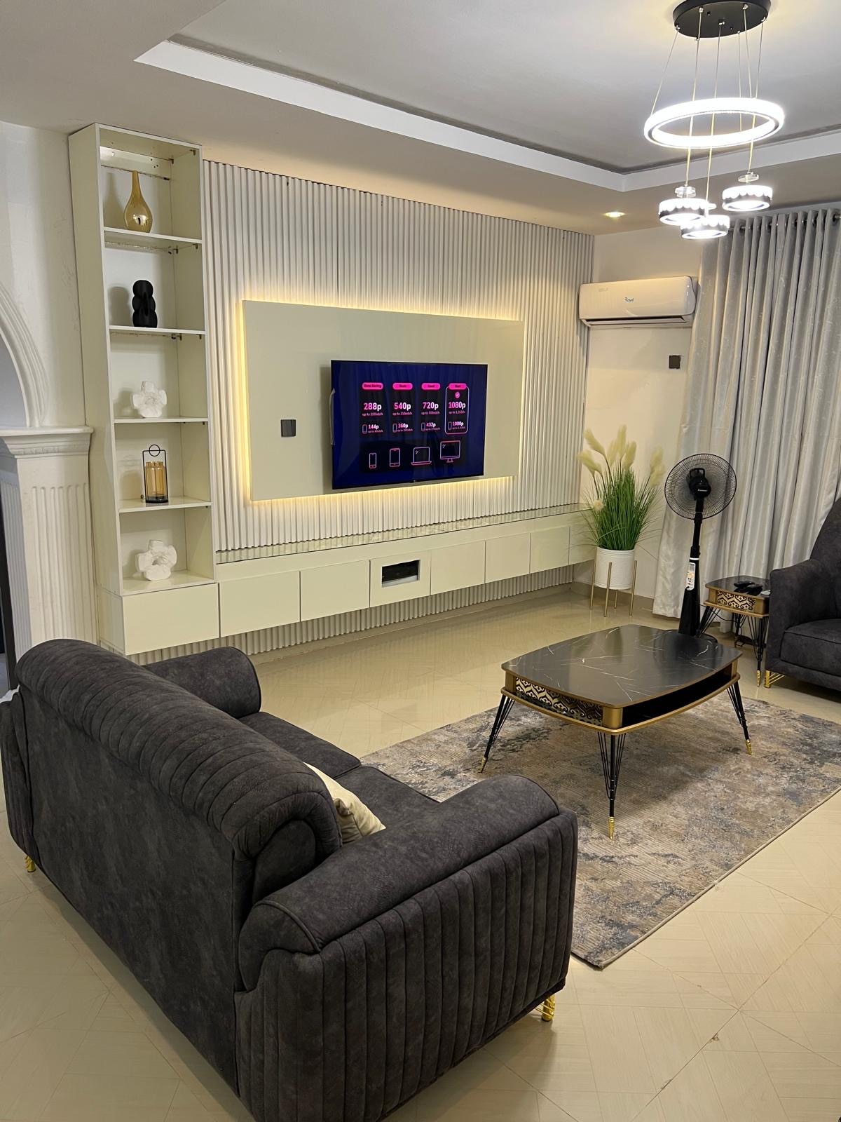 This stylish 3-bedroom apartment offers a comfortable and modern living space, perfect for both short-term stays and extended visits. The layout includes a bright and airy living room, a fully equipped kitchen, and three cozy bedrooms, each furnished with comfortable beds. Located in the prime central area of Wuse 2, Abuja, it is close to the Central Business District and fine dining restaurants, making it an ideal choice for those looking for convenience and comfort.