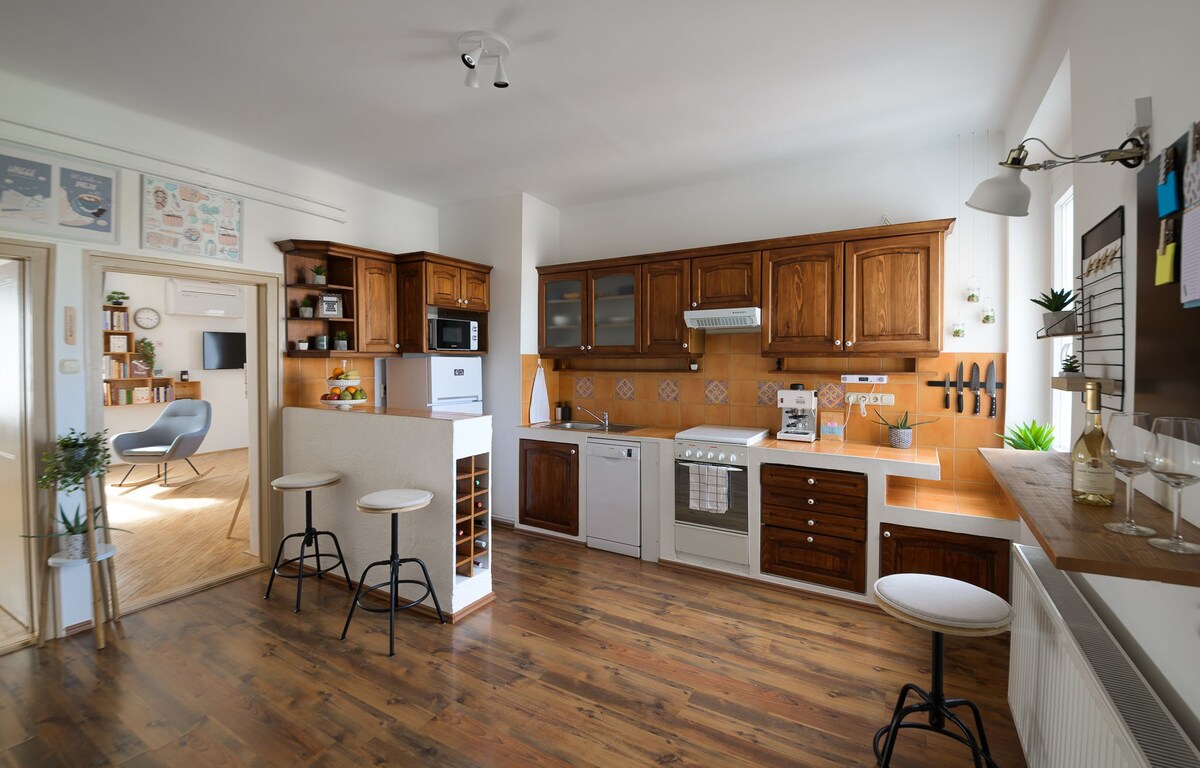 Escape to our quiet, family-friendly 2-bedroom apartment in Győr! This bright 64 m² retreat comfortably fits 4 guests and is perfect for families or business travel. Enjoy a fully equipped kitchen, A/C, blazing-fast Wi-Fi, and a peaceful park view. With easy self check-in and free street parking, it's the perfect home base for exploring the city. Located on a calm street, yet close to shops and transport.