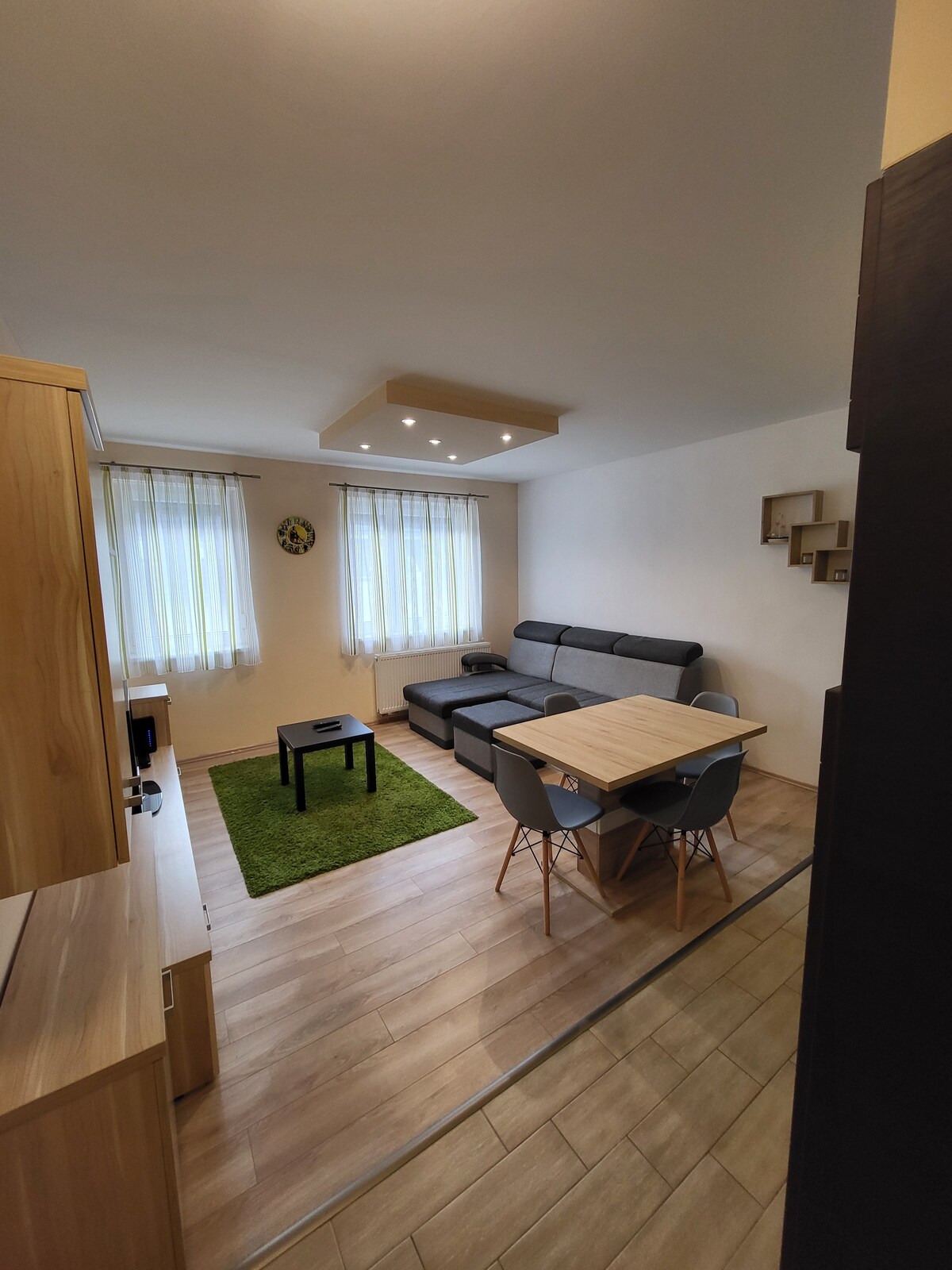 Ovaj elegantni smještaj je savršen izbor za putovanje. Blizina centra grada i mnogih prodavnica i restorana udaljeni su nekoliko minuta hoda od ovog centralnog, ali mirnog mjesta. Blizina željezničkih stanica je također atraktivna ,koji dolaze automobilom i lako vas pronalaze. Naš stan se nalazi na 1. spratu zgrade A, kojoj se može pristupiti liftom. Naš dvosobni stan je idealan za porodice ( 2 odrasle osobe za 2 djece). U odvojenom prostoru za spavanje nalazi se kauč na razvlačenje. Nema balkon!