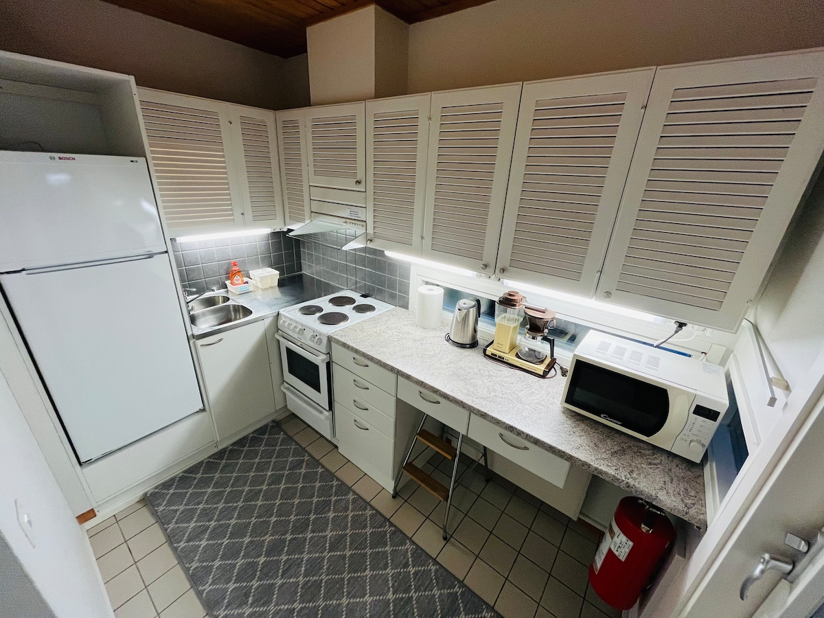 Jednosoban stan u garaži. Mini kuhinja s dvije ploče, frižider (zamrzivač), mikrovalna pećnica, aparat za kafu i čajnik, kao i osnovno posuđe. Posteljina i peškiri su na raspolaganju. Tuš u toaletu, bojler od 30 litara, tople vode ima za oko 5 minuta. Automobil se može puniti ili grijati iz zidnih utičnica. Nedostaju pećnica i mašina za pranje sudova. Brza rezervacija, ako možete rezervisati, možete odsjesti bez mog odgovora Lokacija je odlična i centralna. 10 km do ceste 86, 50 km do ceste 4, 50 km do ceste 8, 530 km do Helsinkija i 480 km do Levija.