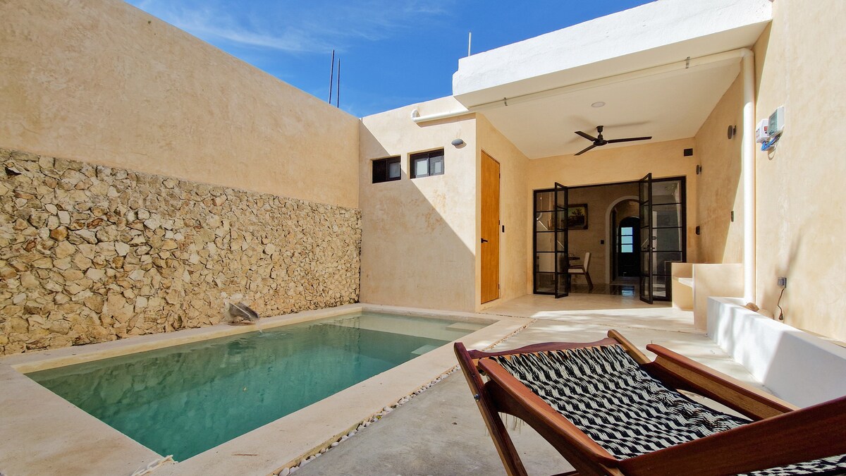 Private home with a great balance of colonial and modern. Perfect for one to two people who enjoy indoor/outdoor living. The house has amazing airflow with 16 foot ceilings throughout and an air conditioned bedroom. The patio and private dipping pool make the house a perfect refuge from the hustle and bustle of downtown. Only 1 block away from La Plancha Park, Merida’s new “Central Park” and 2 blocks from the start of Calle 47 Ruta de Gastronomia, the newly pedestrinized restaurant district.
