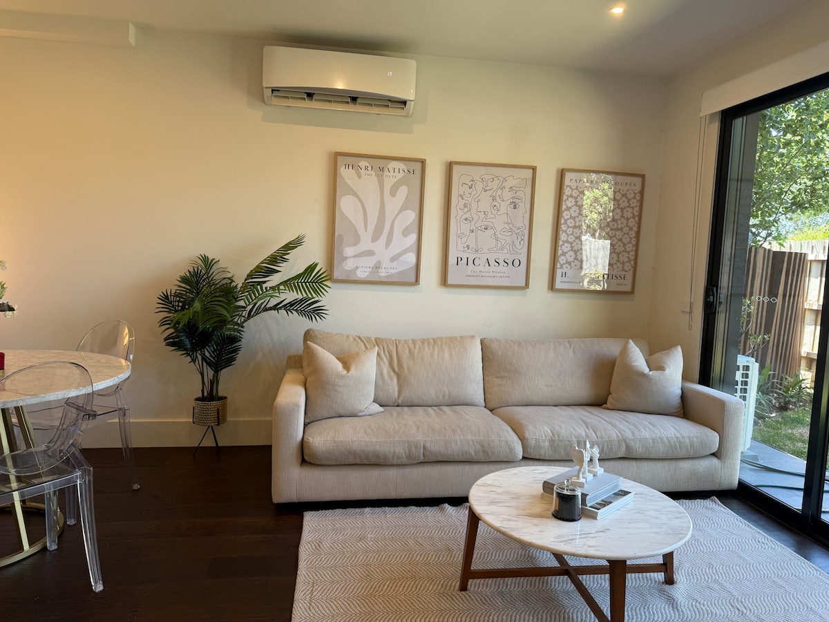 Welcome to a stylish, fully self-contained and private 1BR sanctuary with its own entrance in Bentleigh 。Bright, modern and fully equipped for a comfortable stay, with a compact kitchenette for light meals and a washing machine and dryer.Just a 5-minute walk to Halley Park,Patterson Station, buses, cafés and shops. Close to Chadstone & Southland Shopping Centres, Monash University and Brighton Beach. Pets welcome and must be declared and added to the reservation at booking. Free street parking .