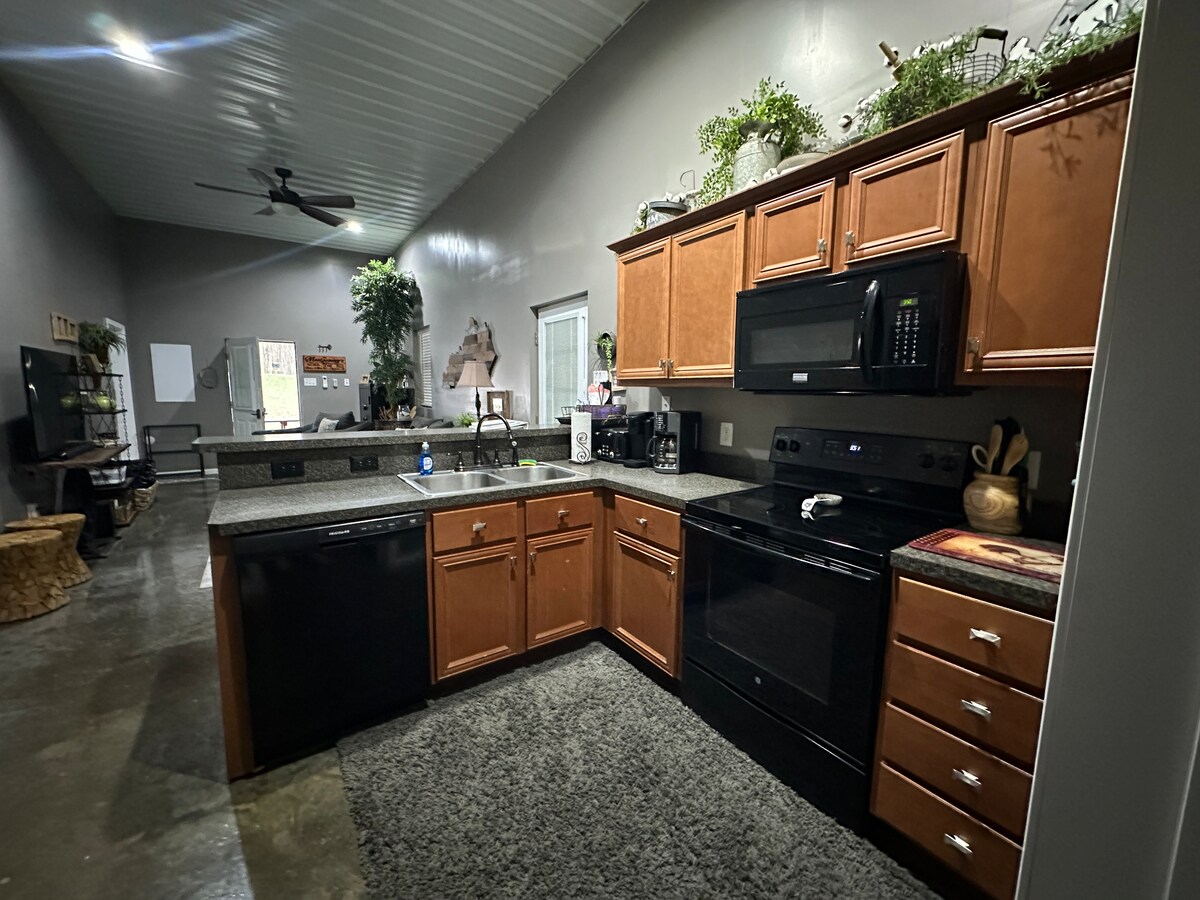 Ako želite da se isključite, opustite i opustite, ovaj barndominij smješten u 93 hektara šume je pravo mjesto za vas. Uživajte u potpuno opremljenoj kuhinji, kupatilu, tri spavaće sobe, omotanom trijemu i velikoj garaži. Prilagođeni kamin s ljuljačkama savršeno je mjesto za provesti večer gledajući zvijezde i uživajući u prirodi. Ovaj smještaj se može pohvaliti mnogim sadržajima, uključujući disc golf, pješačke staze, sjedenje na otvorenom, stolni nogomet, stol za stolni tenis, daske za kukuruz i još mnogo toga. 3 priključka za kamper.
