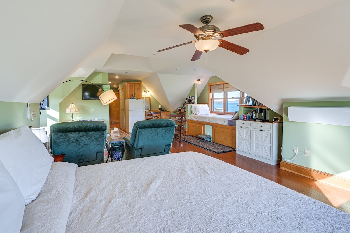 Opustite se u The Loftu, velikom privatnom apartmanu koji uključuje prostor za sjedenje, sjedište pored prozora, čajnu kuhinju i pogled na okean s pogledom na Nacionalni park Acadia. Potkrovlje ima bračni krevet, bračni krevet za jednu osobu, a kauč na razvlačenje se može koristiti kao dodatni krevet za dodatnog gosta. Privatno kupatilo uključuje predimenzioniranu hidromasažnu kadu, tuš kabinu i grijani bide. Uđite i izađite kroz privatni ulaz na stražnjim vratima garaže. Opustite se u zajedničkoj sjenici, ognjištu ili na sezonskom pristaništu.