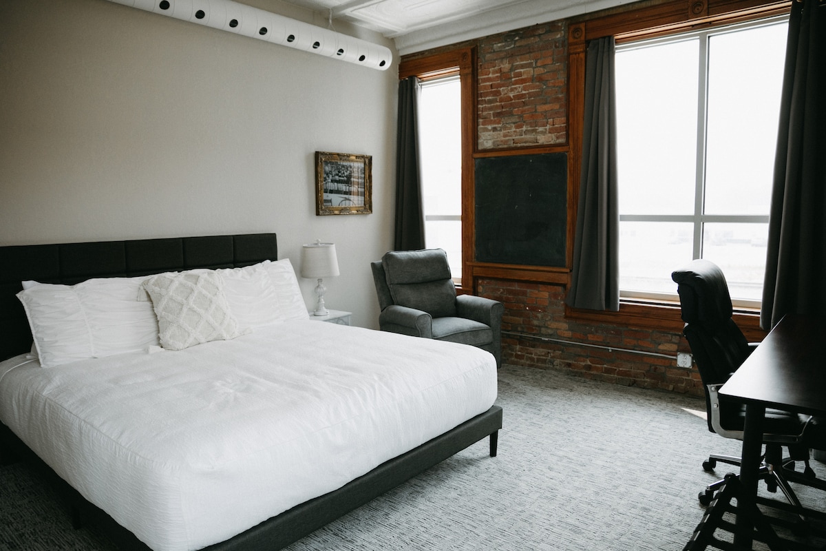 Bricktown Inn, izgrađen 1897. godine, nalazi se u centru Camp Pointa. Naša potpuno renovirana trospratna zgrada od cigle ima deset privatnih soba za noćni najam. Uživajte u ovoj klasičnoj King sobi s jednim bračnim krevetom, TV-om ravnog ekrana od 65 inča, besplatnim bežičnim pristupom internetu, naslonjačem, prostranim radnim stolom i udobnom stolicom. Sve sobe imaju privatno kupatilo. Na svakom spratu imamo zajednički salon i čajnu kuhinju koju možete koristiti.