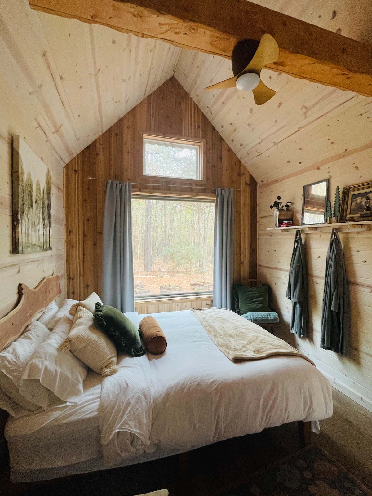 Can you say RESTFUL RETREAT?! Nestled on 20+ acres, the cabin is a beautiful place to rejuvenate. The open concept interior is all wood, many planks were hand-crafted for “old world” feel. Kitchenette, desk, loft, and porch. Just three-minute walk from gardens, infrared sauna, soaking tubs, and outdoor showers. A peaceful space to rest, refocus, and refuel. Guest say that our queen-size bed is the most comfortable ever! Conveniently located 1 mile from Interstate 20, 5-10 min town center.