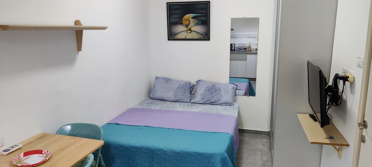 A guest unit which includes a bedroom (12m2), kitchenette, and a separate private shower-room (2.5m2). It is small but fully renovated, clean, and functional. Suitable for singles or couples looking to save on lodging cost by cozying in. Located in beautiful Ramat Poleg. 7 minutes walk to the beach. 15 minutes walk to a major shopping mall. Public transportation is just around the corner