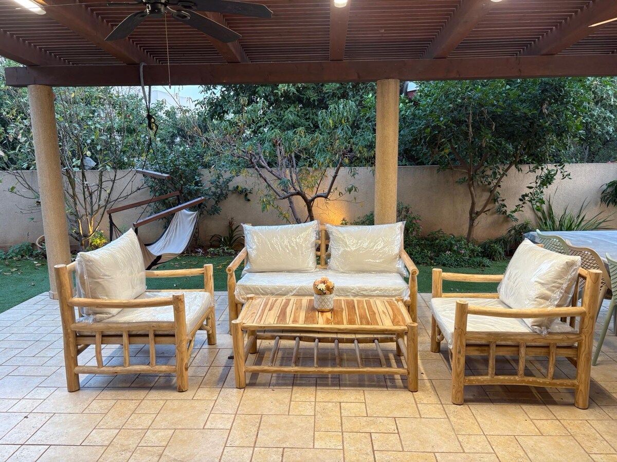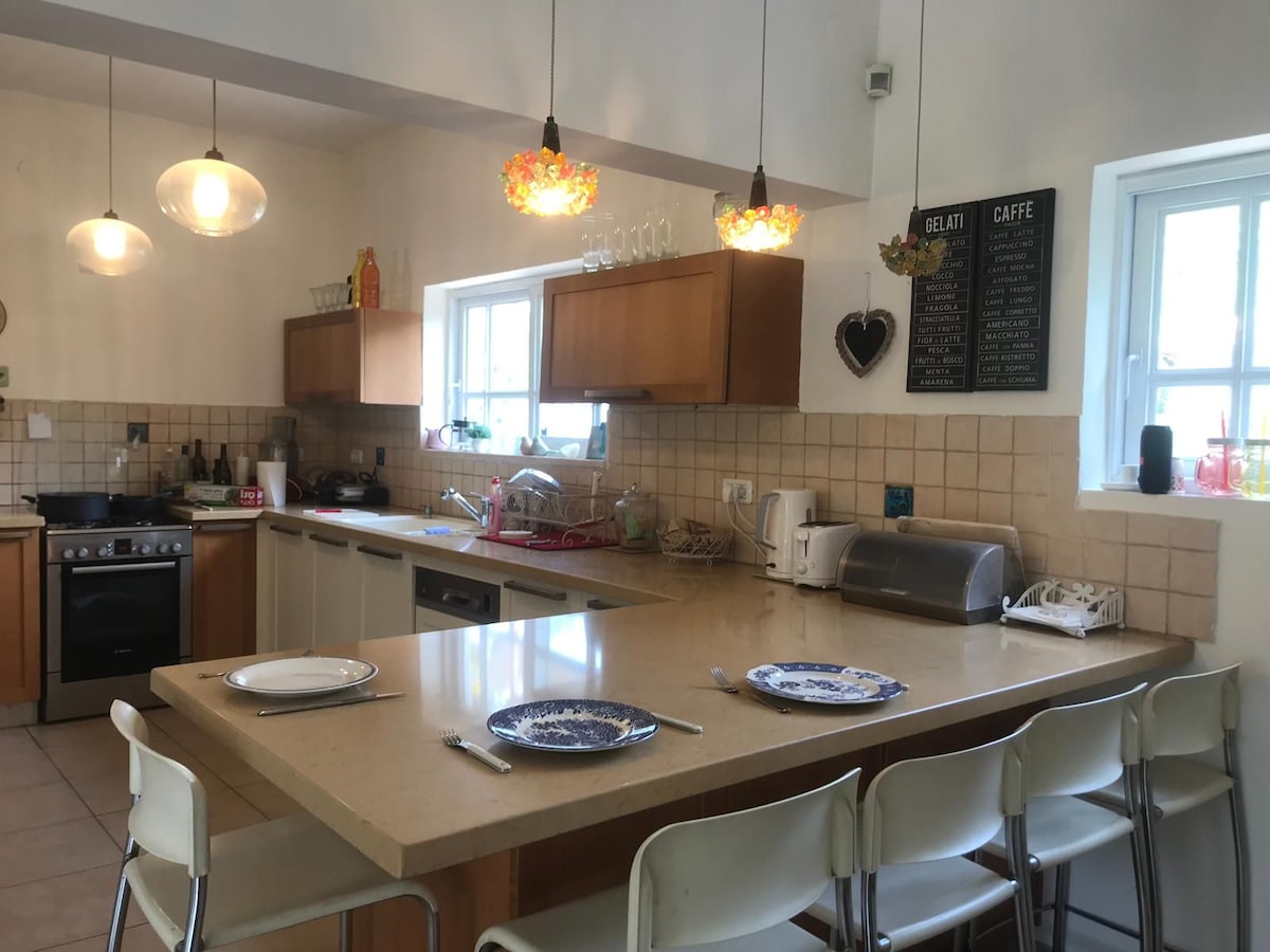 Our house is a sweet, stylish Villa with a beautiful garden. The house is spacious, fully equipped for your comfort, with an amazing kitchen and pleasant sitting areas in&out It is 2 km from a breath-taking beach, 5 km from nightlife and restaurant area (high-end to casual), near public transport, train (10 km to Tel Aviv) & st shopping centre & malls Couples, families, friends and businessmen would love it