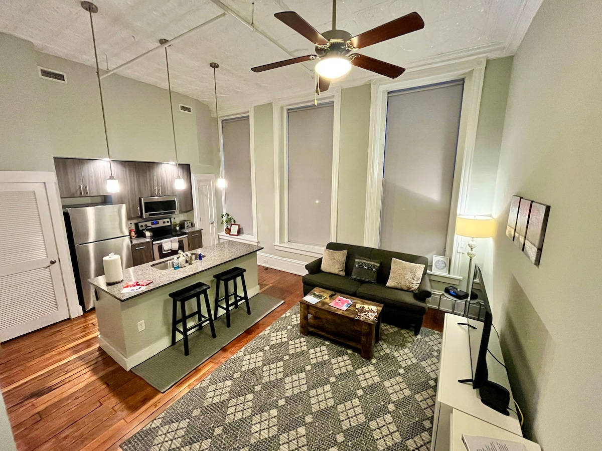 Primary guest must be 25 years old. We greet all guests in person upon arrival, you will be required to present a valid government ID to make a copy of for our records. Centrally located, newly renovated warehouse features 110 year old tin ceilings, heart pine floors, new amenities include granite counters, stainless appliances, central air/heat, ceramic tile baths, dishwasher, in-unit washer. Late check-in available, 6-10pm for $30 fee. Early check (if available) can be arranged for a $20 fee.