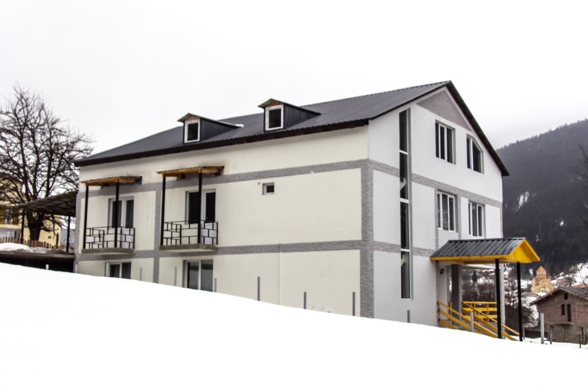 Planinska kuća „Odjek planina” vas poziva u zvuk tišine. Dođite i opustite se u divljini Svanetija s prekrasnim pogledom na planinu Ushba (4.710 m). Planinska kuća se nalazi 10 minuta od centra Mestie, u blizini skijališta Hatsvali, 130 metara od glavne ceste. 4×4 vas može odvesti do planinske kuće, ali ne i mali automobil.