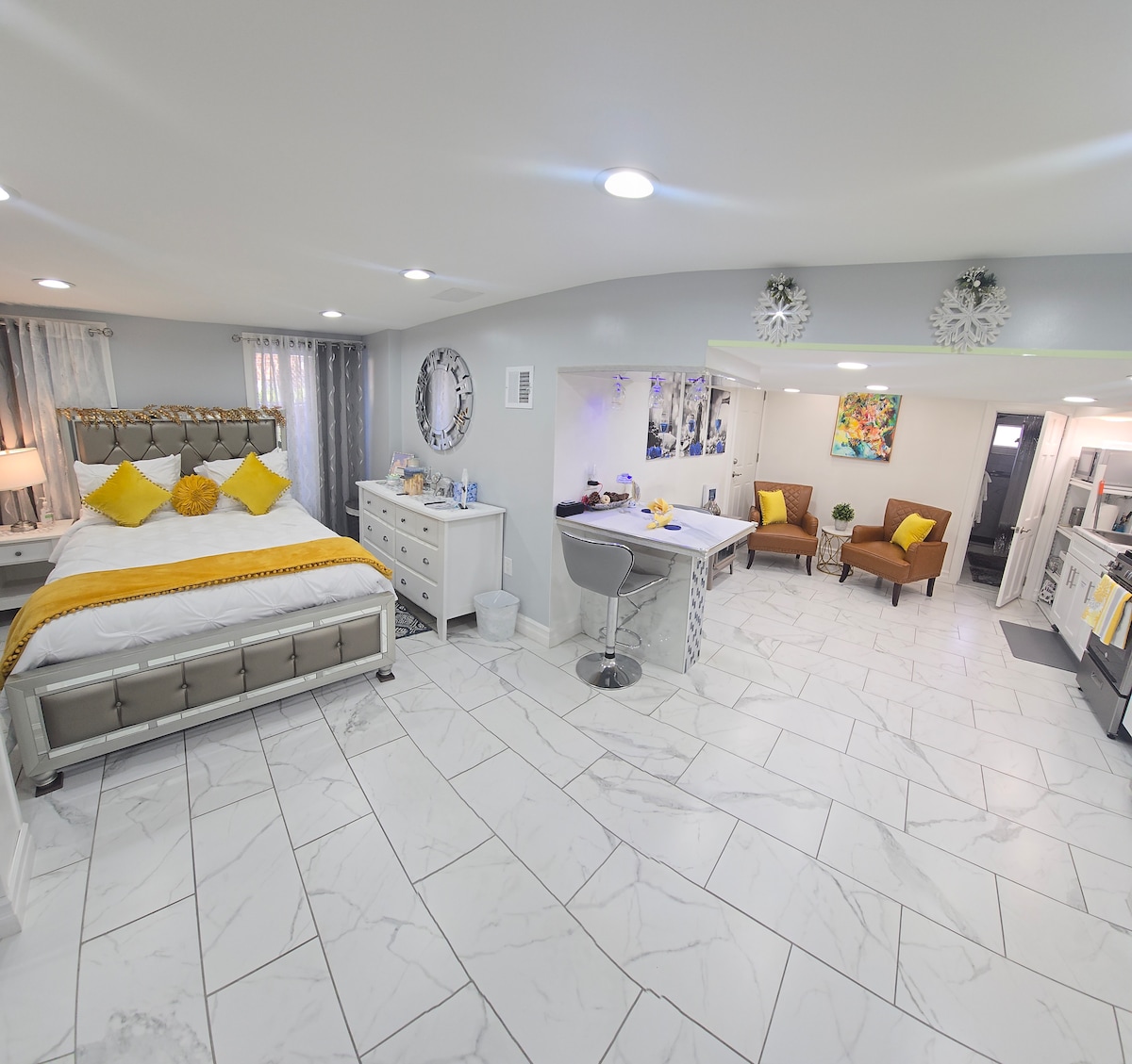 Serenity Suite je funkcionalno dizajniran, otvoren koncept, prostor nižeg nivoa s vlastitim PRIVATNIM ulazom, kuhinjom, spavaćom sobom, kupatilom i prostorima za sjedenje. S čistim savremenim dizajnom i namještajem, The Serenity Suite pruža ugodno, spokojno i sigurno okruženje. Opustite se i opustite u ovom novouređenom prigradskom apartmanu koji se nalazi 10 minuta od UBS Arene i Belmont Parka, 5 minuta od Belt i Southern State Parkways, 15 minuta od JFK-a, 10 minuta do LIRR-a i 25 minuta do lga.