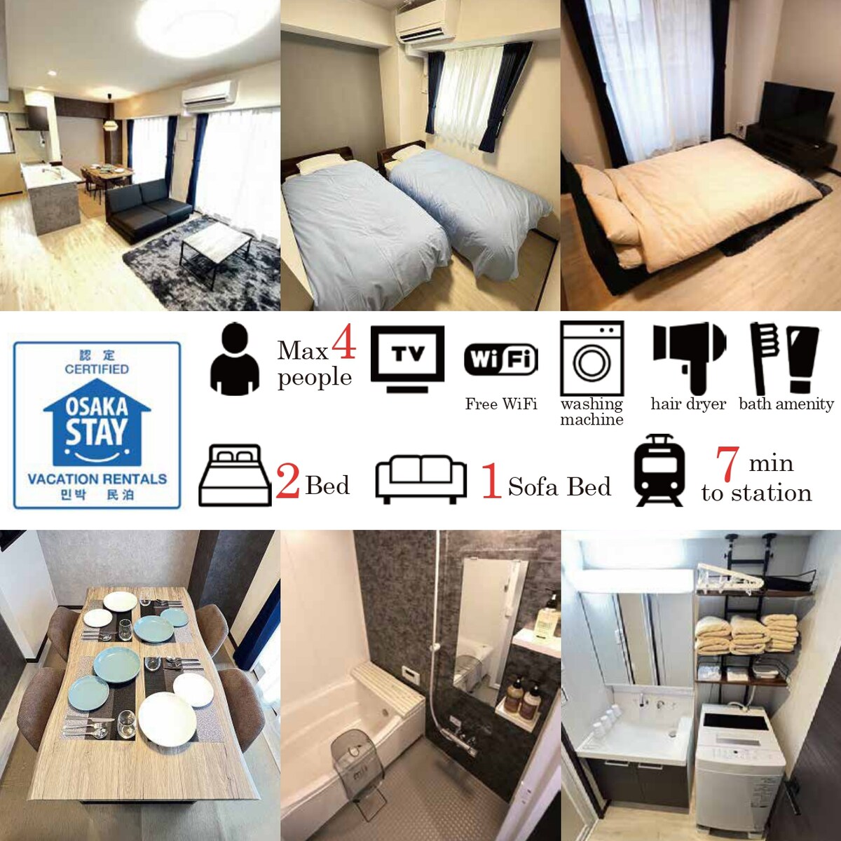 Može primiti do 4 osobe. Ovo je studio jedinica koja se nalazi na 2. ~ 9. spratu. U vašoj sobi imamo kuhinju i trpezarijski sto. Uživajte u obroku jednako udobno kao kod kuće. U sobi imamo i besplatan Wi-Fi i mašinu za pranje veša, pa se preporučuje za dugoročne boravke. Besplatna kafa je dostupna u zajedničkom predvorju na 1. spratu. Opustite se i uživajte na kauču. Pristup Do najbliže stanice Kyobashi ima 2 minute hoda. Stanica JR Osaka Loop Line Kyobashi Metro Keihan Line Osaka Također možete otići u Kyoto i Kobe bez promjene vozova, tako da je to dobra lokacija za razgledanje regije Kansai. U ovom objektu nema parkinga. Kada dođete automobilom, koristite obližnji parking koji se plaća. * Ako ste mlađi od 18 godina, molimo vas da nas unaprijed obavijestite o rezervaciji.