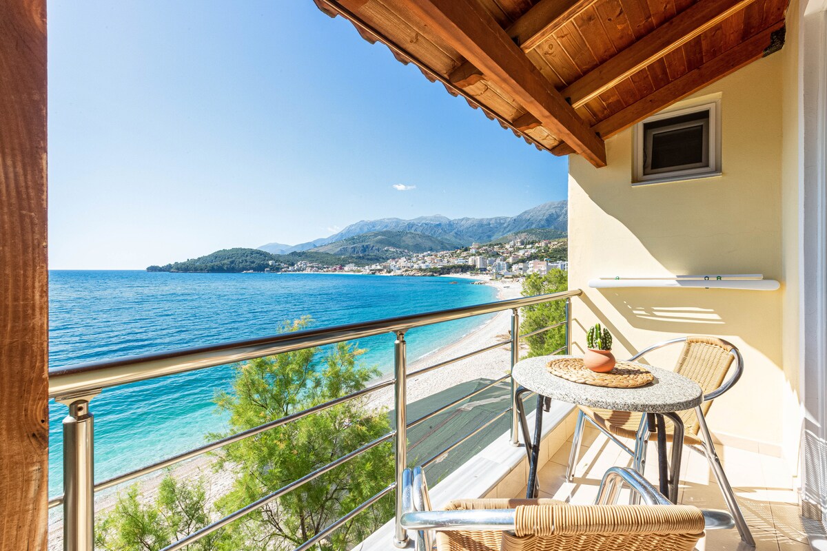 Smještaj koji oduzima dah u brdima Sarande 🇦🇱 Pogled na more i mir Pobjegnite u naše mirne apartmane na brežuljku u prekrasnoj Sarandi u Albaniji. Smještene iznad grada, naše moderne jedinice nude zadivljujući panoramski pogled na Jonsko more, ostrvo Krf i bujno zeleno okruženje. Svaki stan je potpuno namješten s privatnim balkonom, klima uređajem, potpuno opremljenom kuhinjom i brzim Wi-Fi mrežom. Uživajte u najboljem od oba svijeta, na samo nekoliko minuta vožnje od plaže i centra grada.