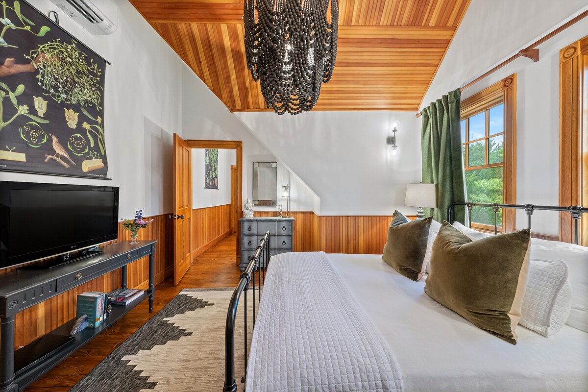 Gosti koji traže potpuni mir često traže ovu laganu sobu u uglu koja nudi ambijent spokoja, prozore s dvostrukom ekspozicijom, bračni krevet, stolicu za leptire i malo privatno kupatilo. Imajte na umu da je ovo naša najmanja soba za goste i da nudi izuzetno udoban smještaj s pristupom stražnjim vratima na drugom spratu.