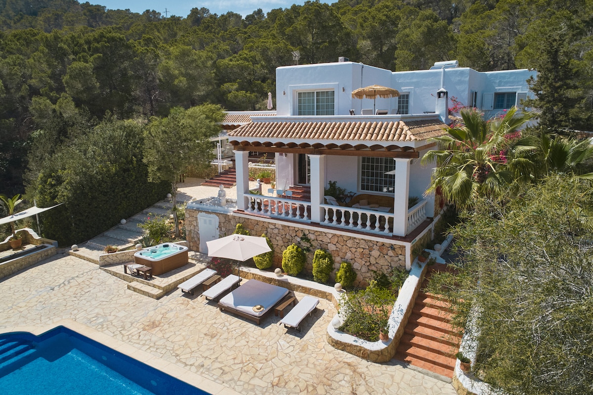 Idilična privatna vila, 5 minuta od Pikesa (Ibiza Rocks House) 10 minuta do San Antonia, 20 minuta do Ibiza Towna. Bazen za plivanje, vanjski jacuzzi i roštilj, zona za opuštanje, razne terase, zrele vrtove .ky TV i Wi-Fi Salon na krovu (SKRIVENI URL) u svim spavaćim sobama