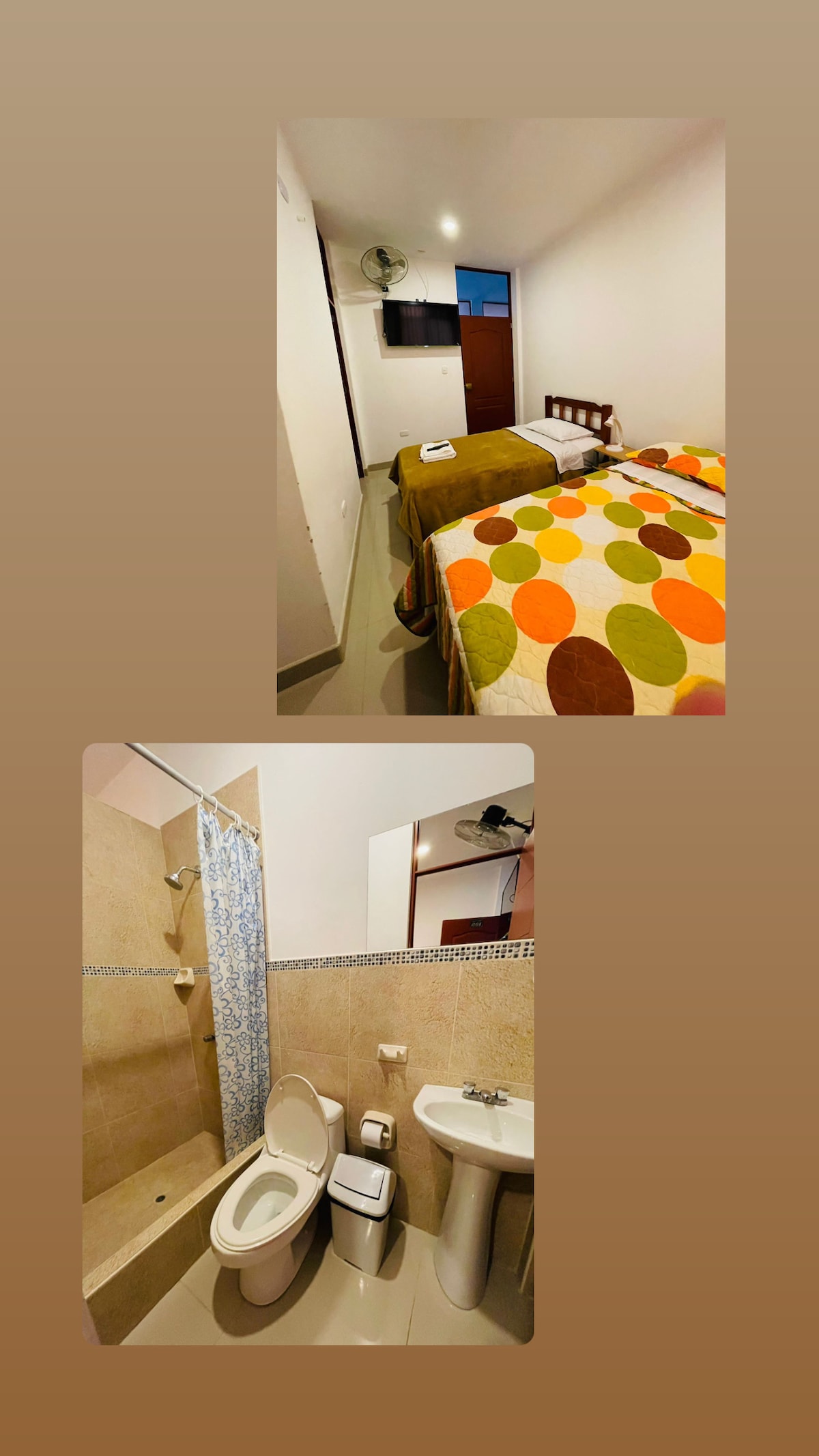 Nuevo Hotel con 22 hab, más de 2100 m2 de área construida, 2000 m2 de área social. 2 piscinas, estacionamientos exclusivos. Ascensores, ser de wifi, direc tv, netflix, prime, disney. Terrazas en el primer piso y 4to piso. Hab familiares amplias, hab matrimoniales, todas con baño incluido, kit de baño. Tv de 55". Colchones de la marca Rosen modelo Neo 2024 en king size y queen. Esta es una pequeña hab, con cama queen, Tv de 50" y baño propio. No tiene ventanas, pero cuenta con A/C.