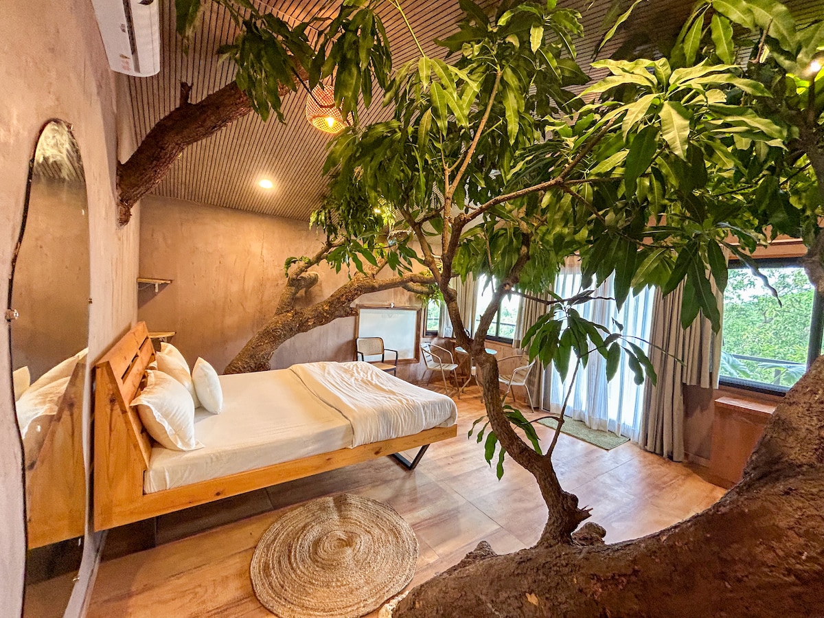 Perched on a mango tree with breathtaking valley and mountain views, Sutra is a unique treehouse where nature lives with you — the tree itself grows inside the room. Blending sustainable design with modern amenities, it offers comfort, charm, and a private deck to unwind. Perfect for couples, solo travelers, or a small family of three seeking a peaceful escape into the wild.
