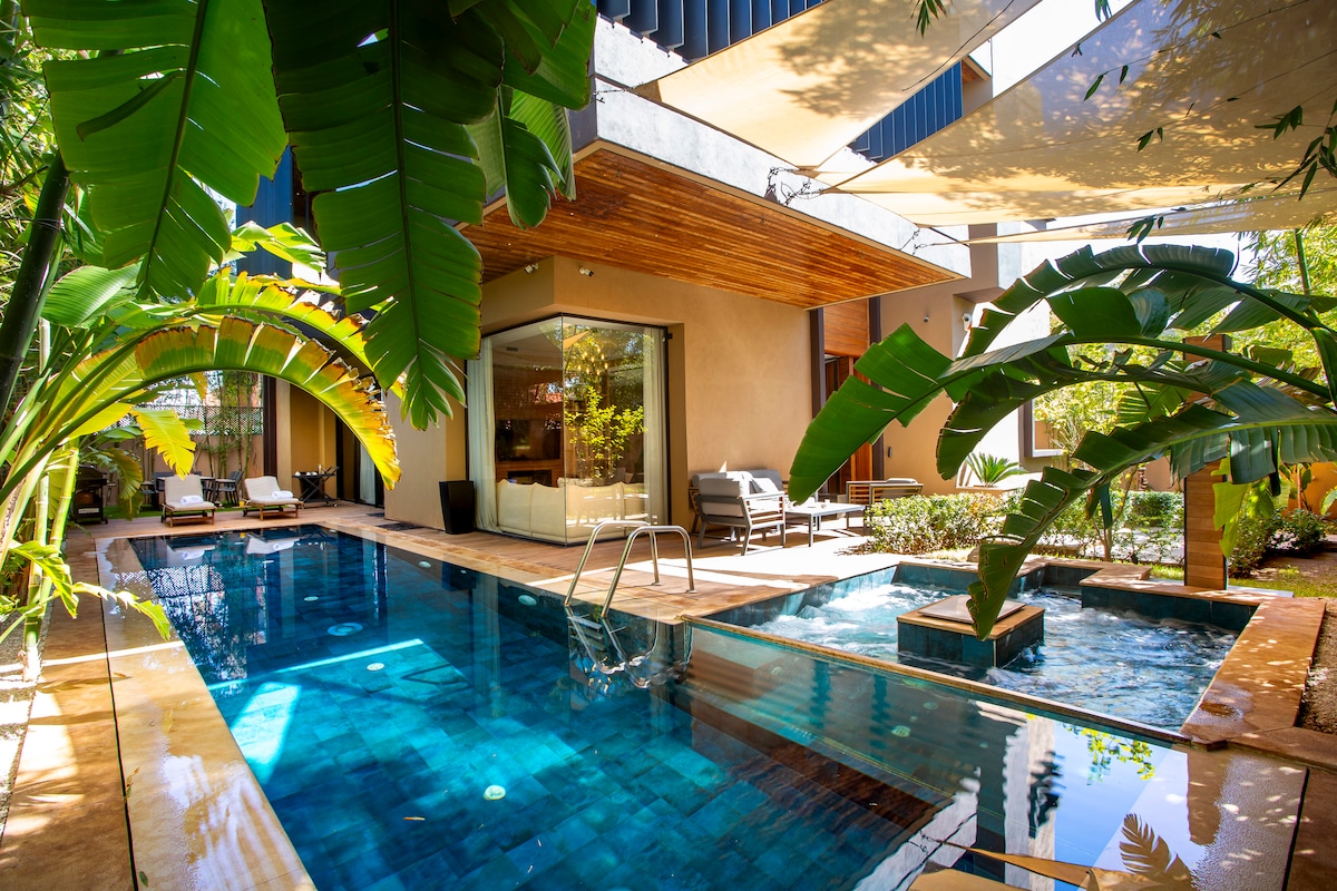 Rijetka dizajnerska vila smještena na privatnom zemljištu, nudi potpuni mir, prekrasan pogled na planine Atlas i zapanjujući beskonačni bazen stvoren za nezaboravne boravke u blizini Marakeša. Uživajte u profinjenom boravku u zatvorenom i na otvorenom, uređenim enterijerima i mirnim zalascima sunca, uz besplatan marokanski doručak prvog jutra.