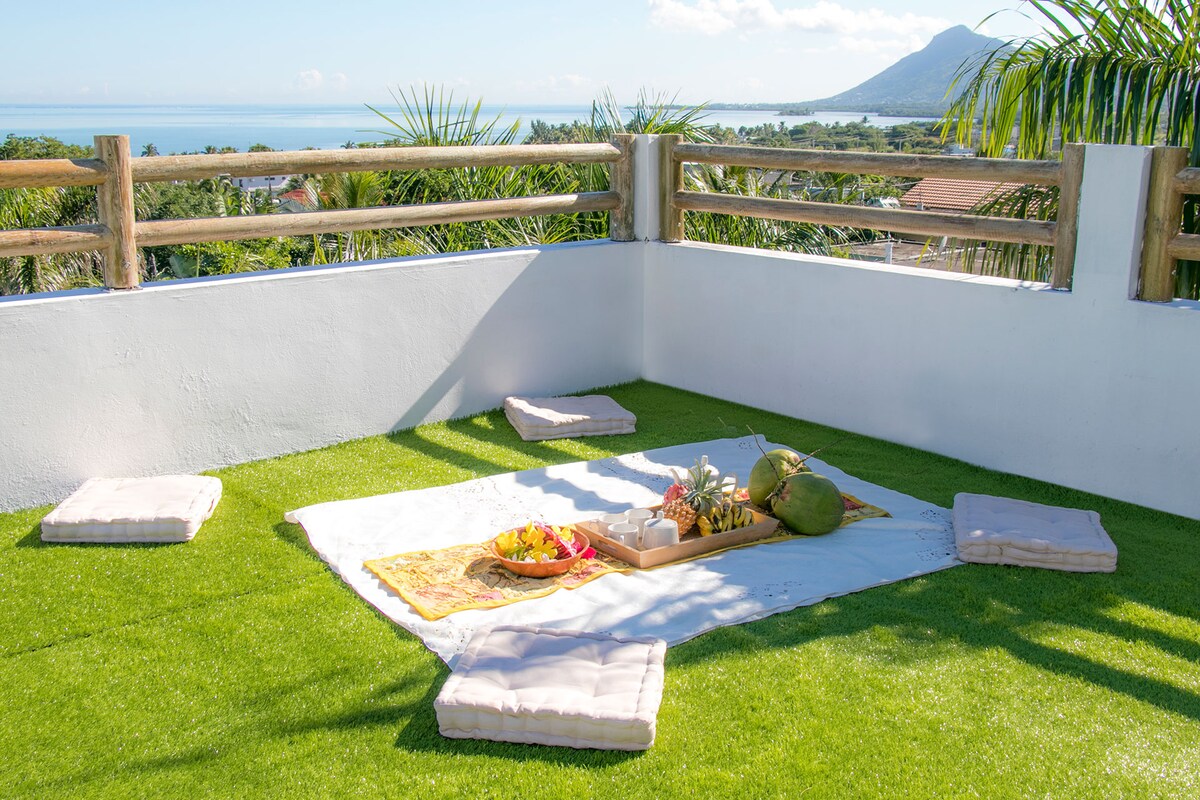 (Minimalni boravak od 5 noćenja) Dođite i isključite se u Seaview Studios na mirnoj obali Case Noyale. Vrlo dobro smješten između Black Rivera i Le Mornea. Samo 900 m do lokalnog supermarketa (La Gaulette) i 7 km vožnje do plaže Le Morne Kite. Pobrinut ćemo se da imate sve što vam je potrebno i da se osjećate kao kod kuće uz naše gostoprimstvo. Imate potpunu privatnost, bez susjednih kuća na vidiku, samo pogled na okean, palme i pusto ostrvo Benitier. Parking, instaliran sigurnosni sistem.