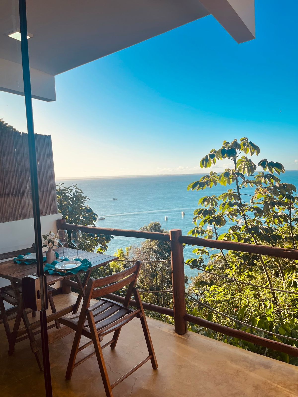 No alto do Morro de São Paulo, o Canto das Águas é um refúgio com vista para o mar e o pôr do sol de tirar o fôlego. Da praça central até aqui é uma caminhada de 15–20 min (1km), com algumas ladeiras e degraus. A recompensa é toda beleza natural exclusiva e privacidade. Ideal para casais, amigos ou viajantes solo que querem acordar com o azul do oceano. Estamos a 80m acima do nível do mar, com acesso do condomínio às trilhas para as praias Porto de Cima, Ponta da Pedra, Praia da Argila e Gamboa.