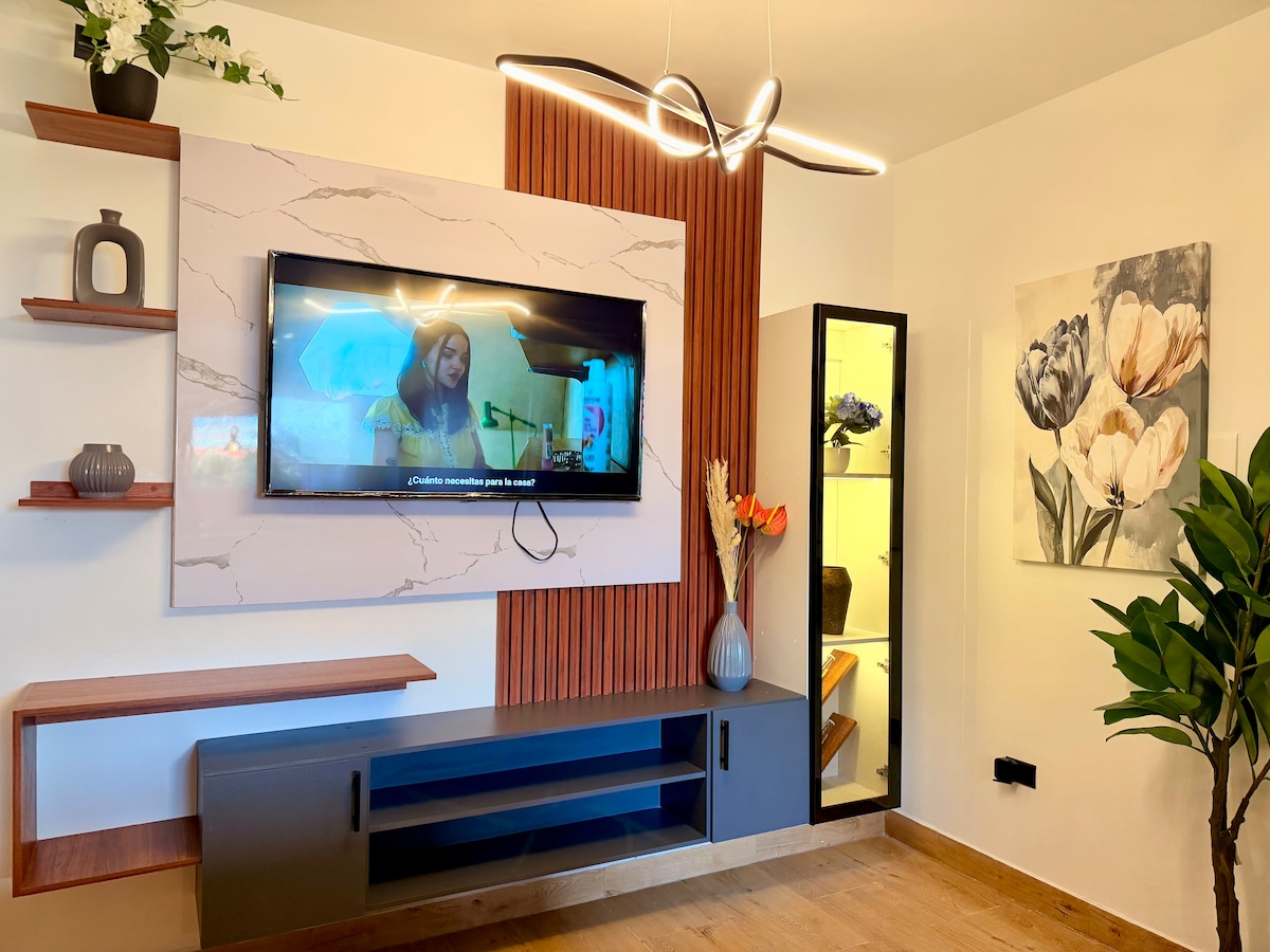 Departamento amplio: Dormitorio Master con baño completo, 2 dormitorios con closet, baño completo compartido, sala con Tv, zona de trabajo (escritorio), comedor (6 puestos), cocina equipada, baño social, máquinas lavado y secado. Servicios: Wi-Fi, parqueadero, agua 24 horas. Servicios Adicionales: Área BBQ Cancha de volley