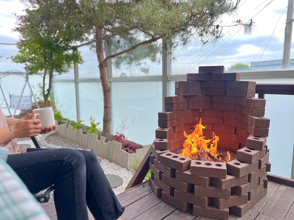 Ovo je samostojeća kuća koja se nalazi u Ganghwa-eupu, Ganghwa-gun. Kultura komšiluka je živa, pa se preporučuje onima koji su tihi i tihi. Cijeli drugi kat se koristi kao privatna kuća, a to je privatna kapija, tako da možete ostati privatno bez suočavanja s domaćinom. Drveće se nalazi u dvorištu i oko njega na prvom spratu, tako da možete čuti i ptice tokom boravka. Možete prošetati do Ganghwa-eupa kako biste istražili okolinu, kulturne znamenitosti, restorane i poznate kafiće (kao što je Choyang Ji), a možete naručiti dostavu hrane. Na prostranom balkonu na drugom katu možete pojesti i roštilj s luksuznim ugljenom.(Ako se prijavite unaprijed, mi ćemo ga pripremiti za vas.) Smještaj je podijeljen na sobe + dnevne sobe + kuhinju + WC, a u kupatilu se nalazi prostrana kada za toplo kupatilo. Garantujem dobar san sa bračnim krevetom i zračnim madracem. U dnevnoj sobi postoji TV na kojem možete uživati u filmovima na YouTubeu i Netflixu.
