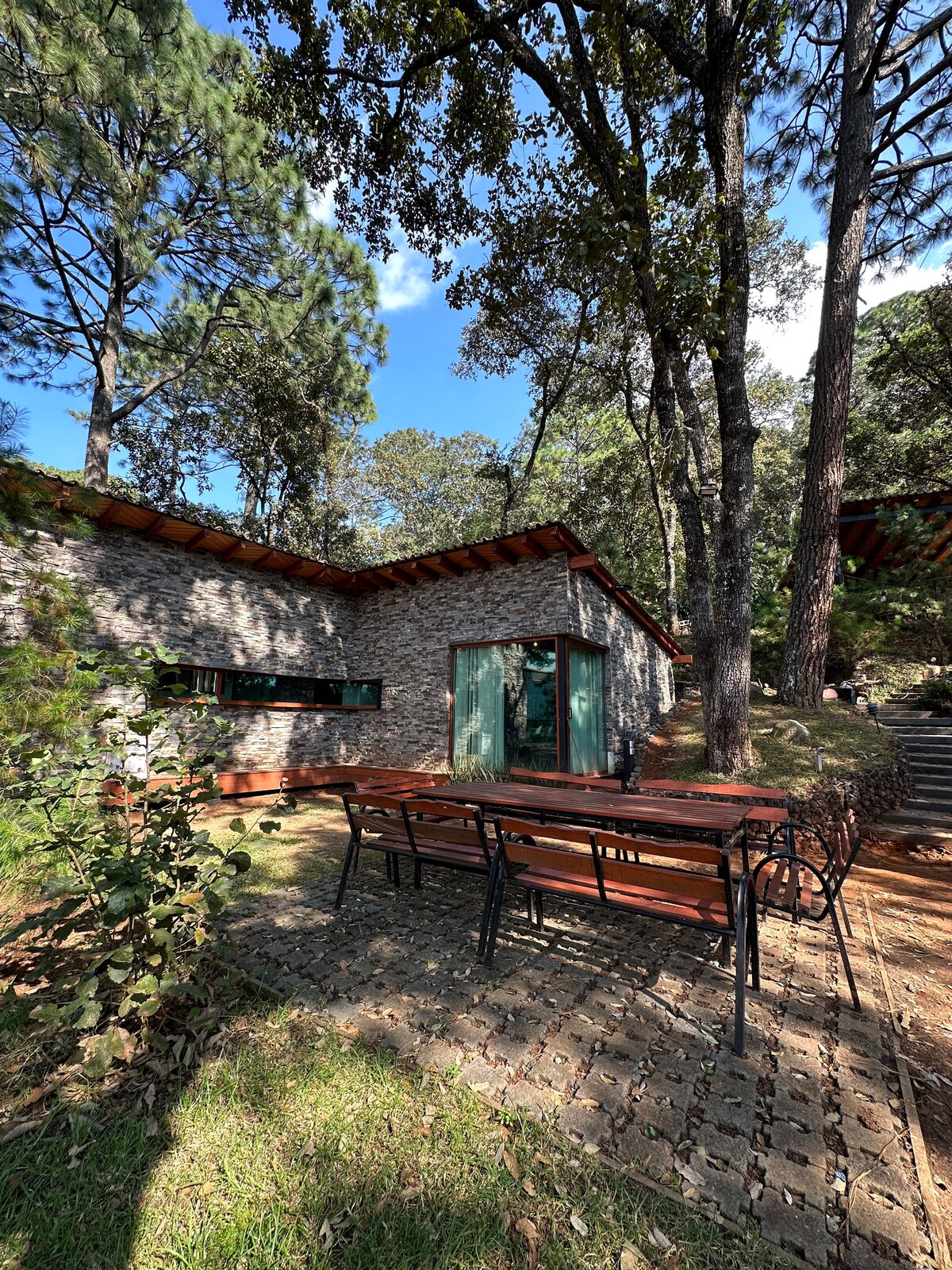 Opustite se na ovom jedinstvenom i mirnom odmoru. Uživajte u šetnji šumom uz udobnost grada. Dvije spavaće sobe, jedna na spratu s kombinovanim kupatilom, minibarom, terasom, s velikim bračnim krevetom, a druga s dva bračna kreveta. Vani ćete pronaći lijepu logorsku vatru za ugodne noći pod zvijezdama. Imate pristup trpezariji na otvorenom koja ima roštilj i roštilj za uživanje u mesu asadas usred šume.