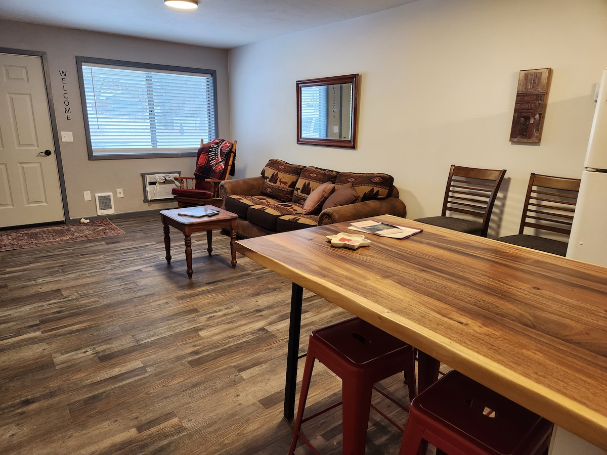 Studio za boravak je savršen bazni kamp za sve što McCall ima za ponuditi. Ovaj udobni studio apartman je opremljen vašim osnovnim potrepštinama. Smješten u mirnom kvartu izvan utabanih staza s pogledom na planinu Brundage. Uživajte u zalasku sunca s prednje terase nakon cjelodnevnog istraživanja. Unutra ćete pronaći izuzetno udoban bračni krevet savršen za dvoje. Čajna kuhinja je jednostavna i jednostavna. Kućni ljubimci su dobrodošli uz dodatnu naknadu za kućne ljubimce!