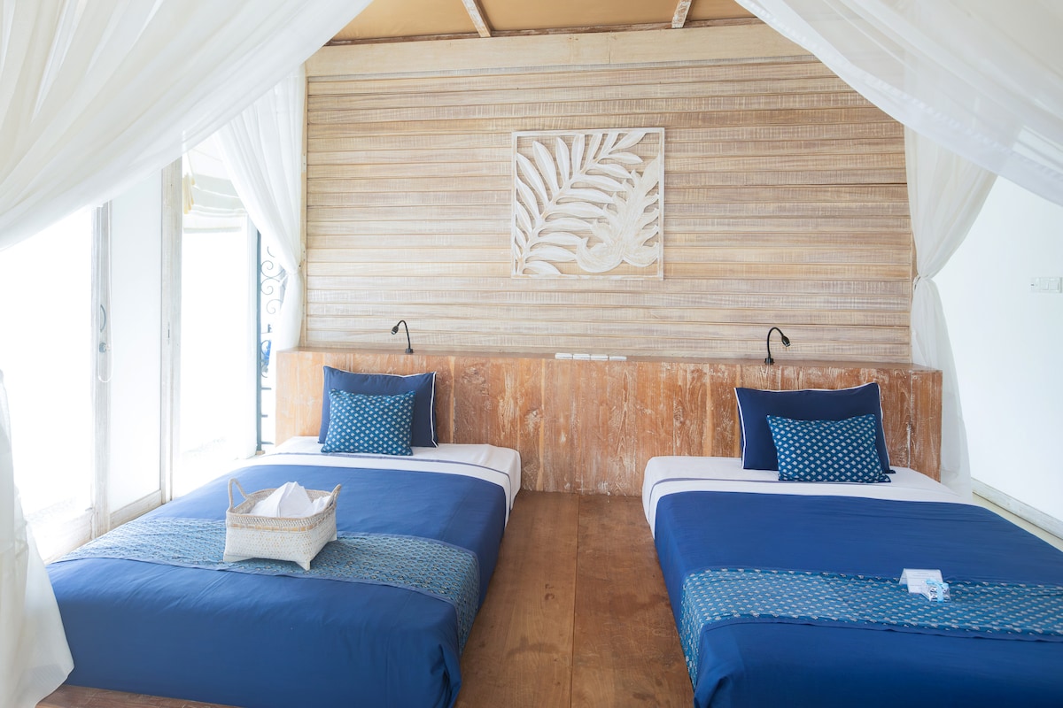 This room is a spacious and luxurious apartment measuring 87 square meters. It features a king-size (wide 240 cm) canopy bed, with an option to request hollywood twin beds. The expansive outdoor bathroom includes a terrazzo bathtub with a view of the sky and a dressing space. The living room, designed in Balinese style with high ceilings, comes with a fully equipped kitchen. In front of the terrace, you'll find public swimming pool. Capacity: 2–3 guests (extra bed available upon request).