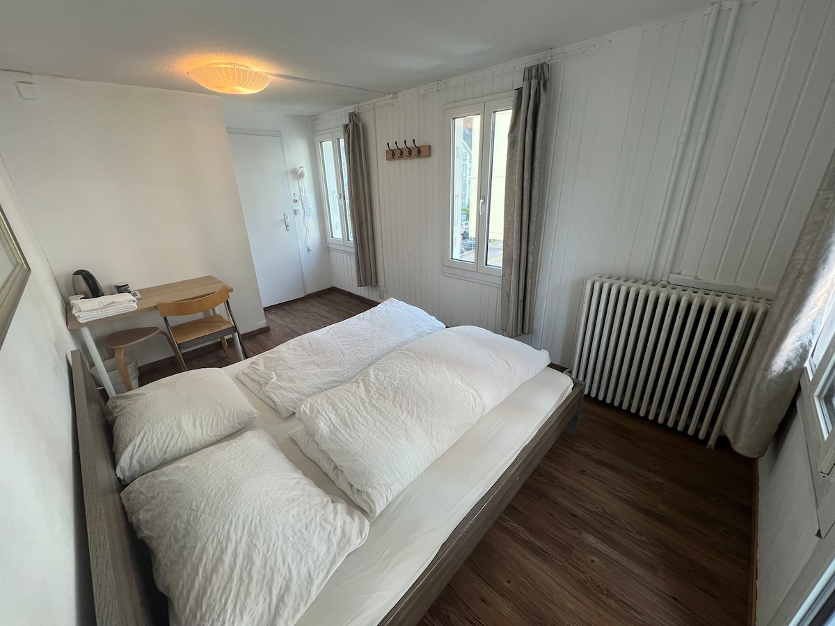 Kuća se nalazi u centru grada Interlakena, odmah pored glavne ulice Höheweg: Samo oko 300 metara od željezničke stanice Interlaken West. Soba je na drugom spratu.(Nema lifta) Soba je mala, baš kao na slici. Stepenice do gornjeg sprata su prilično uske. Postoje 3 zajednička kupatila(dijele ih 8 soba) i 2 zajedničke kuhinje (Kuhinja je u potpunosti opremljena rernom, mikrovalnom pećnicom, kuhalom za rižu, frižiderom, priborom za jelo itd.)