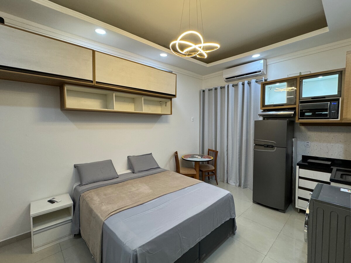 Hospede-se em um espaço moderno e aconchegante no Condomínio Rio de Janeiro – Studio Maceió. • Flat novo e bem planejado • Quarto com cama de casal, enxoval completo e armários planejados • Janelas amplas com ótima iluminação natural e vista para a cidade •Cozinha equipada com utensílios e mesa posta para refeições •Banheiro moderno. Diferenciais Condomínio seguro e moderno Excelente iluminação natural. Móveis planejados e ambiente aconchegante. Ideal para estadias de curta ou longa duraç