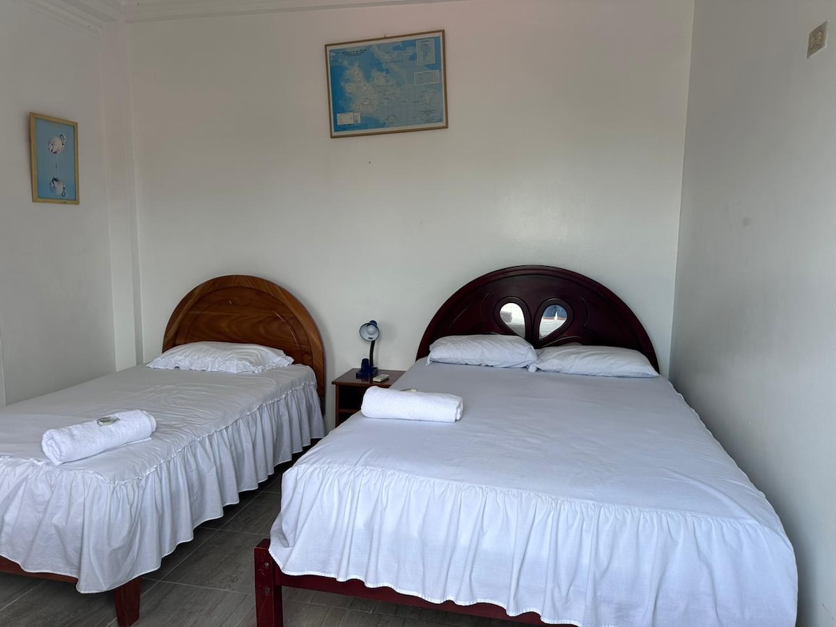 La habitación está ubicada a una cuadra de la playa de Puerto Villamil, la habitación cuenta con tres camas, baño privado. Es perfecto para tres viajeros que busca disfrutar al máximo de su estadía, noches de encanto, y ambiente de primera.