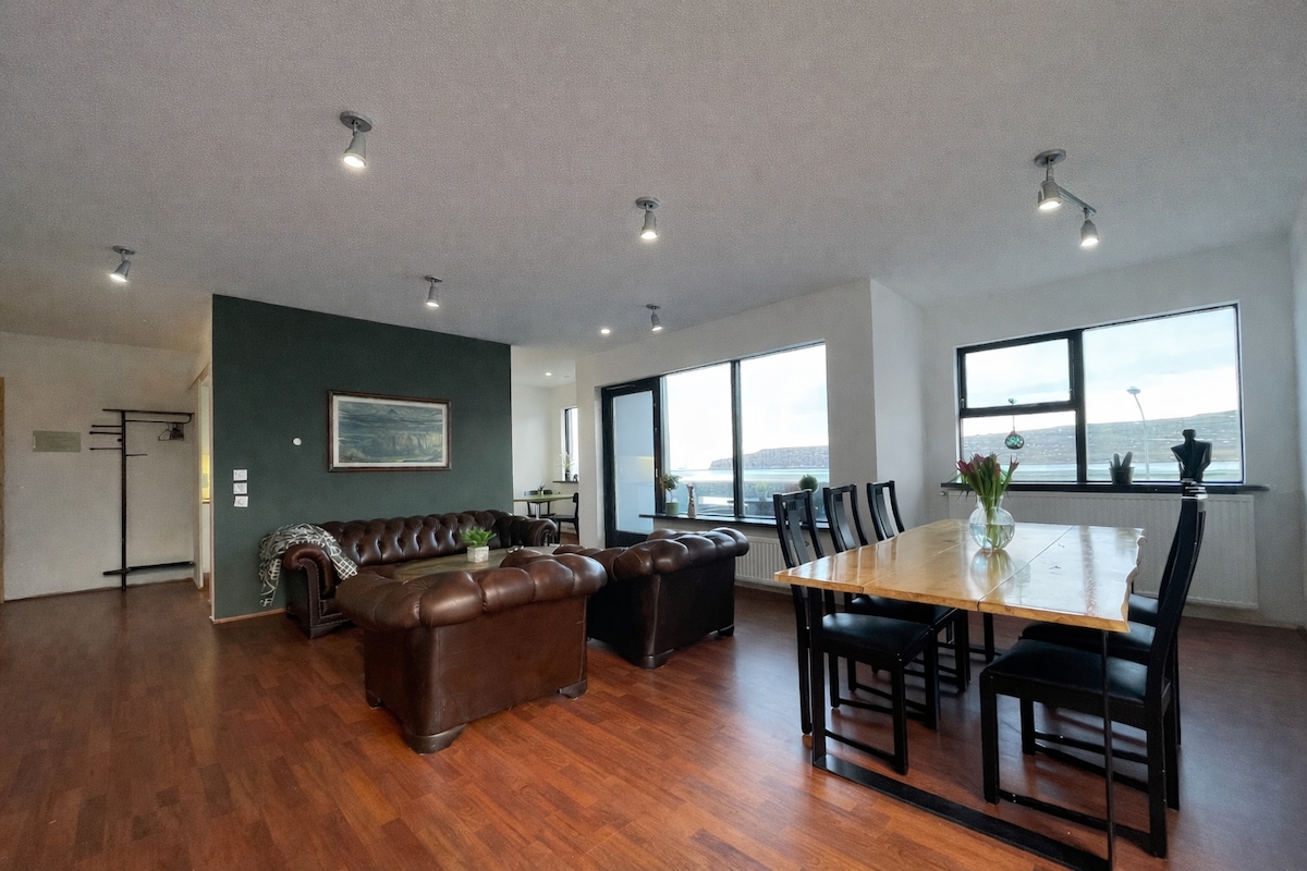 Prekrasan stan u penthouseu u srcu Isafjordura iznad glavnog trga, Silfurtorg. Stan je nedavno renoviran s dvije dvokrevetne sobe i velikim otvorenim prostorom za kuhinju, trpezariju i dnevnu sobu. Ima velike balkone s obje strane i ležaljku za sunčanje. Vrlo udoban i lijep stan i potpuno opremljena kuhinja i elegantan namještaj.