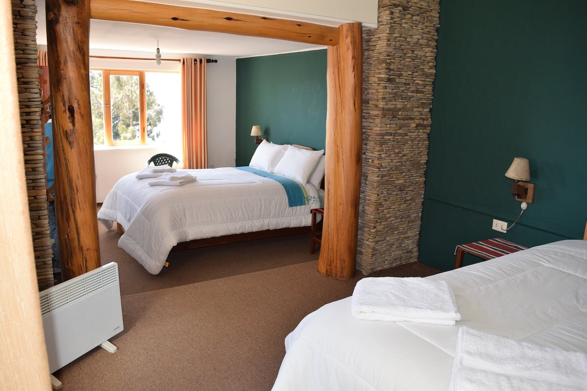 Hermosa habitación familiar dúplex en cuarto piso, muy cómoda con cuatro camas y dos sofá camas, cuenta con dos baños completos, bellísima vista de el lago Titikaka. El hotel se encuentra sobre la playa del lago, en zona tranquila, el hotel tiene garaje, areas comunes de recreacion, el desayuno esta incluido.