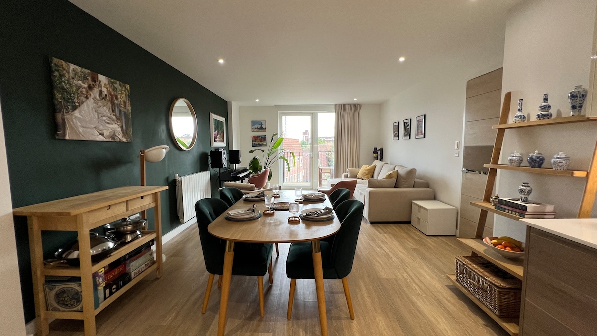 Modern balcony flat 5 min from station | 6 min train to London Bridge & 15 min to Soho. Stay in vibrant Deptford with cafés and markets nearby. Fully equipped for short or long stays, the apartment features tasteful modern décor, a US‑size queen bed (King UK) with blackout curtains, a well‑stocked kitchen, and high‑speed Wi‑Fi. Relax on the park‑view balcony, just 5 min from the tube, and enjoy seamless self‑check‑in, washer/dryer inside the flat, and smart TV for a stress‑free London stay.