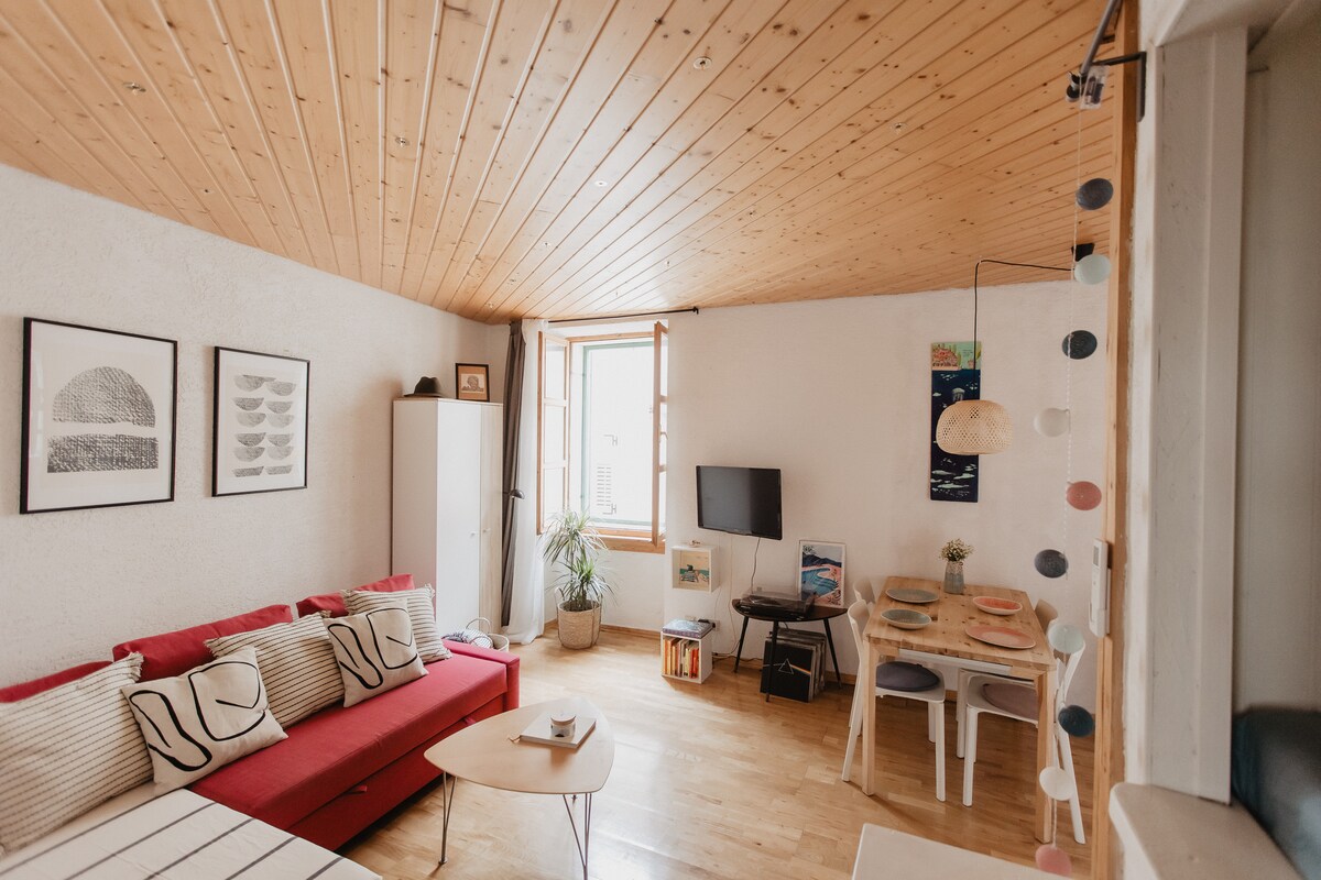 Stan ima dvije etaže, površine 54 m2. Na glavnom spratu se nalazi dnevni boravak sa kuhinjom u istom velikom prostoru, kupatilo i šarmantan balkon . Uz stepenice ćete pronaći romantičnu spavaću sobu s malim prostorom za sjedenje. Primaju se kućni ljubimci i primaju jedan kućni ljubimac besplatno, ali će se naplaćivati naknada od 5€ po danu za svakog dodatnog kućnog ljubimca tokom prvog dana.